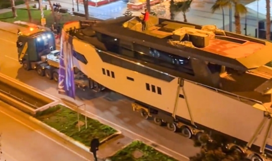 Antalya Döşemealtı'nda YRP'nin adayı Mesut Hekimoğlu, fabrikasında üç yılda yapılan ve Dubaili bir iş insanının satın aldığı lüks yatın üzerinde olduğu TIR'la seçim çalışması yaptı.