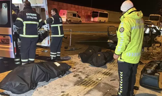 Korkunç kaza Edirne'de meydana geldi. Sürücüsünün kontrolünü kaybettiği araç evin duvarına çarparak alev aldı. Olay yerine gelen ekiplerin müdahalesiyle yangın söndürülürken, araçta yapılan incelemede 20'li yaşlardaki 2 kadın ve 2 erkeğin yaşamını yitirdiği belirlendi.