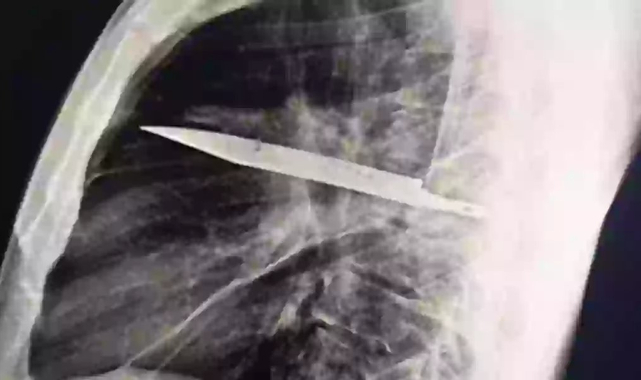Hasta, “göğüs ağrısı” şikayetiyle değil; sağ memesinin altından fekal (irinli) bir akıntı gelmesi üzerine hastaneye gitti. Önemli diğer semptomlar—nefes darlığı, öksürük, ateş gibi—gözlemlenmedi. Genel sağlık durumu normaldi .Ayrıntılı sorgulamada, sekiz yıl önce yaşadığı bir kavga sırasında yüzüne, sırtına, göğsüne ve karın bölgesine birçok bıçak darbesi aldığı ortaya çıktı. Bu olay sonrası sadece yüzeysel bir pansuman uygulanmış, görülen hastanede röntgen veya görüntüleme yapılmamıştı .Yıllarca herhangi bir belirti yaşamayan adam, tekrar başvurduğunda yapılan röntgen görüntüsünde, sağ kürek kemiği (skapula) hizasından göğsüne saplı halde bir bıçak parçası tespit edildi. Bıçak, çevresinde nekrotik doku ve iltihap birikimiyle çevrilidir .Müdahale ve SonrasıHemen cerrahi müdahale gerçekleştirildi; bıçak cerrahi olarak çıkarıldı ve enfekte doku temizlendi. Operasyonu takiben hasta yoğun bakımda izlendikten sonra yaklaşık 10 gün içinde taburcu edildi. Takip muayeneleri sorunsuz geçti ve hastanın durumu iyiydi .