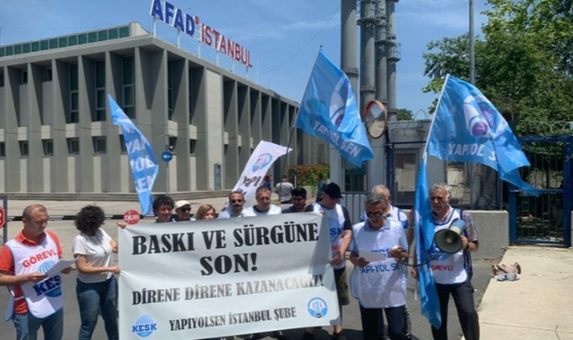 Yapı-Yol Sendikası üyeleri, AFAD'da çalışan 2 sendika temsilcisinin kurumun çeşitli uygulamalarını eleştirdikleri ve çalışma koşullarındaki olumsuzlukları dile getirdiği için Şırnak’a sürgün edilmesine tepki gösterdi.
