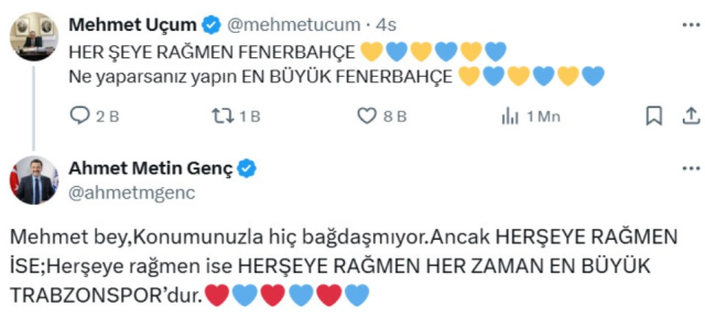 Paylaşıma yanıt veren AK Partili başkan Genç ise şu yanıtı verdi; "Mehmet Bey, konumuzla hiç bağdaşmıyor ancak her şeye rağmen ise; her şeye rağmen her zaman en büyük Trabzonspor'dur."