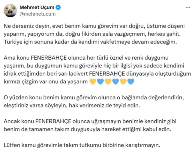 Bu yanıtın ardından bir paylaşım daha yapan Başdanışman Uçum, "Ne derseniz deyin, evet benim kamu görevim var doğru, üstüme düşeni yaparım, yapıyorum da, doğru fikirden asla vazgeçmem, herkes şahit. Türkiye için sonuna kadar da kendimi vakfetmeye devam edeceğim.Ama konu Fenerbahçe olunca her türlü öznel ve renk duygumu yaşarım, bu duygumun kamu göreviyle hiç bir ilgisi yok sadece kendimi idrak ettiğimden beri sarı lacivert Fenerbahçe dünyasıyla oluşturduğum kırmızı çizgim var onu da yaşarım. O yüzden konu benim kamu görevim olunca o bağlamda değerlendirin, eleştiriniz varsa söyleyin, hak verirseniz de teyid edin. Ancak konu Fenerbahçe olunca uğraşmayın benimle kendiniz gibi benim de tamamen takım duygusuyla hareket ettiğimi kabul edin. Lütfen kamu görevimle takım tutkumu birbirine karıştırmayın" dedi.