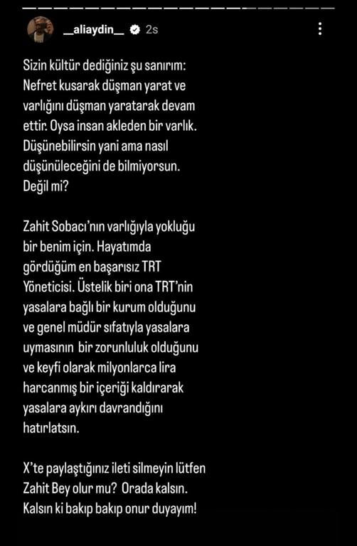 Bugün ülke genelinde yapılan boykota destek paylaşımı yapmasının ardından hedef gösterilen, TRT'de yayınlanan Teşkilat dizisinde rol alan Aybüke Pusat'a, TRT'nin Tabii platformunun en çok izlenen dizilerinden biri olan Mevlana Celaleddin-i Rûmi'nin senaristi Ali Aydın destek vermişti.TRT Genel Müdürü Zahid Sobacı, senarist Ali Aydın'ı kastederek "Yıllar önce gerçekleştirilen bir projede yer alan bu şahsın TRT ile hiçbir kurumsal bağı yoktur" dedi ve Rumi dizisinin Tabii'nin kütüphanesinden kaldırıldığına dair bir ekran görüntüsü paylaştı.Sobacı'nın X hesabından yaptığı paylaşıma tepki gösteren Aydın, diziyi Zahid Sobacı göreve başlamadan önce yazmaya başladığını belirtti.Sobacı'ya seslenen Aydın, "Vizyonsuzluğunuzu bu kadar aşikâr kıldığınız için size teşekkür ederim" dedi.