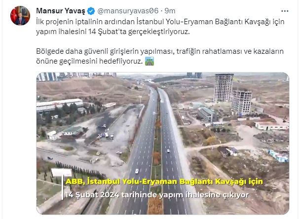 ANKARA BÜYÜKŞEHİR ERYAMAN-İSTANBUL YOLU BAĞLANTI KAVŞAĞI İÇİN KOLLARI SIVADI: YAPIM İHALESİ 14 ŞUBAT 2024'TE