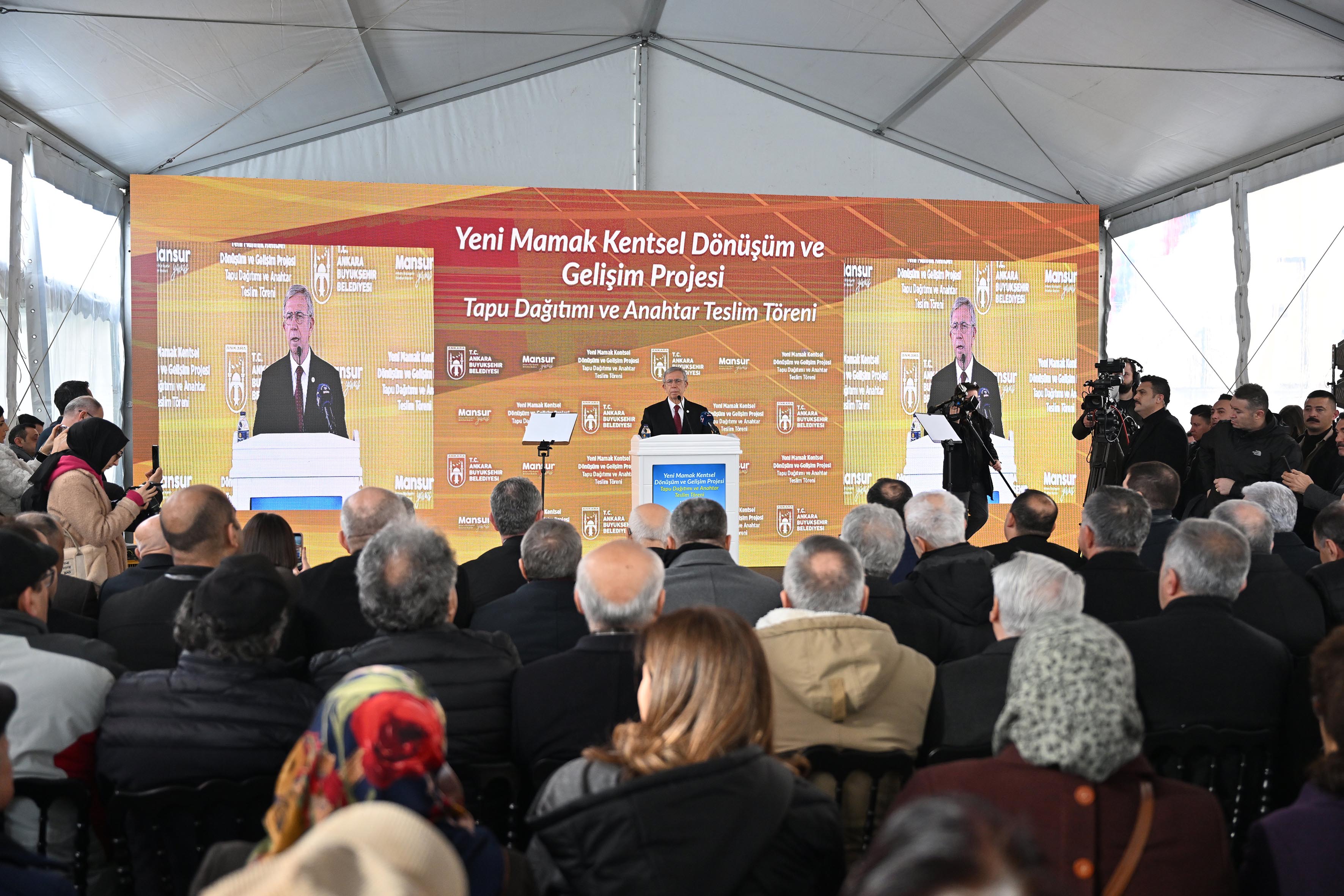Yeni Mamak Kentsel Dönüşüm ve Gelişim Projesi 5. Etap 52681 Ada 1 Parselde tamamlanan, 166 adet konutun tapu dağıtımı ve anahtar teslim töreni gerçekleştirildi.Hak sahiplerine tapularını teslim eden Ankara Büyükşehir Belediye Başkanı Mansur Yavaş, "Bugün 166 adet konut sizlere teslim edilecek. Cenab-ı Allah güle güle oturmayı nasip etsin. Üzüntüm şudur; maalesef vefat edenler var, göremediler bugünleri…Bunun müsebbibi kim? Yani elinde imkân varken, elinde para varken bu borcu ödemek yerine gidip çalışmayan, projelere para yatırıp ondan sonra ben Ankara’ya proje yaptım diyenler değil midir? Farkımız bu…Farkımız sizlerden aldığımız parayı size harcamak. Öncelikli olarak borcumuzdan kurtulup bu insanların mağduriyetini ortadan kaldırmak" dedi.
