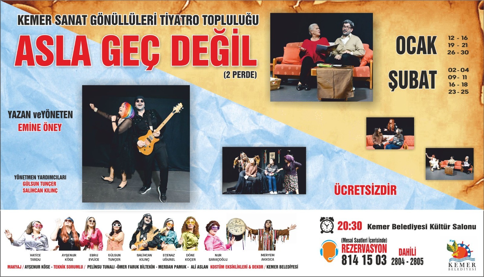 Senaryosunu Emine Öney’in yazdığı ve yönettiği “Asla Geç Değil” tiyatro oyunu seyirci ile buluşmaya hazırlanıyor. Kemer Sanat Gönüllüleri Tiyatro Topluluğu tarafından sergilenecek olan tiyatro oyununun ilk gösterimi 12 Ocak Cuma günü saat 20.30’da seyirci karşısına çıkacak. Kemer Belediyesi’nin destekleriyle toplam 2 perdeden oluşacak olan oyun, Kemer Belediyesi Kültür Salonu’nda sergilenecek. Yönetmen yardımcılığı koltuğunda Gülsun Tunçer ile Salihcan Kılınç’ın oturduğu oyun, 12-16, 19-21, 26-30 Ocak, 2-4, 9-11, 16-18 ve 23 25 Şubat tarihleri arasında da seyirci ile buluşacak. Not: Rezervasyon için: 0242 814 15 03 - 28 04, 05