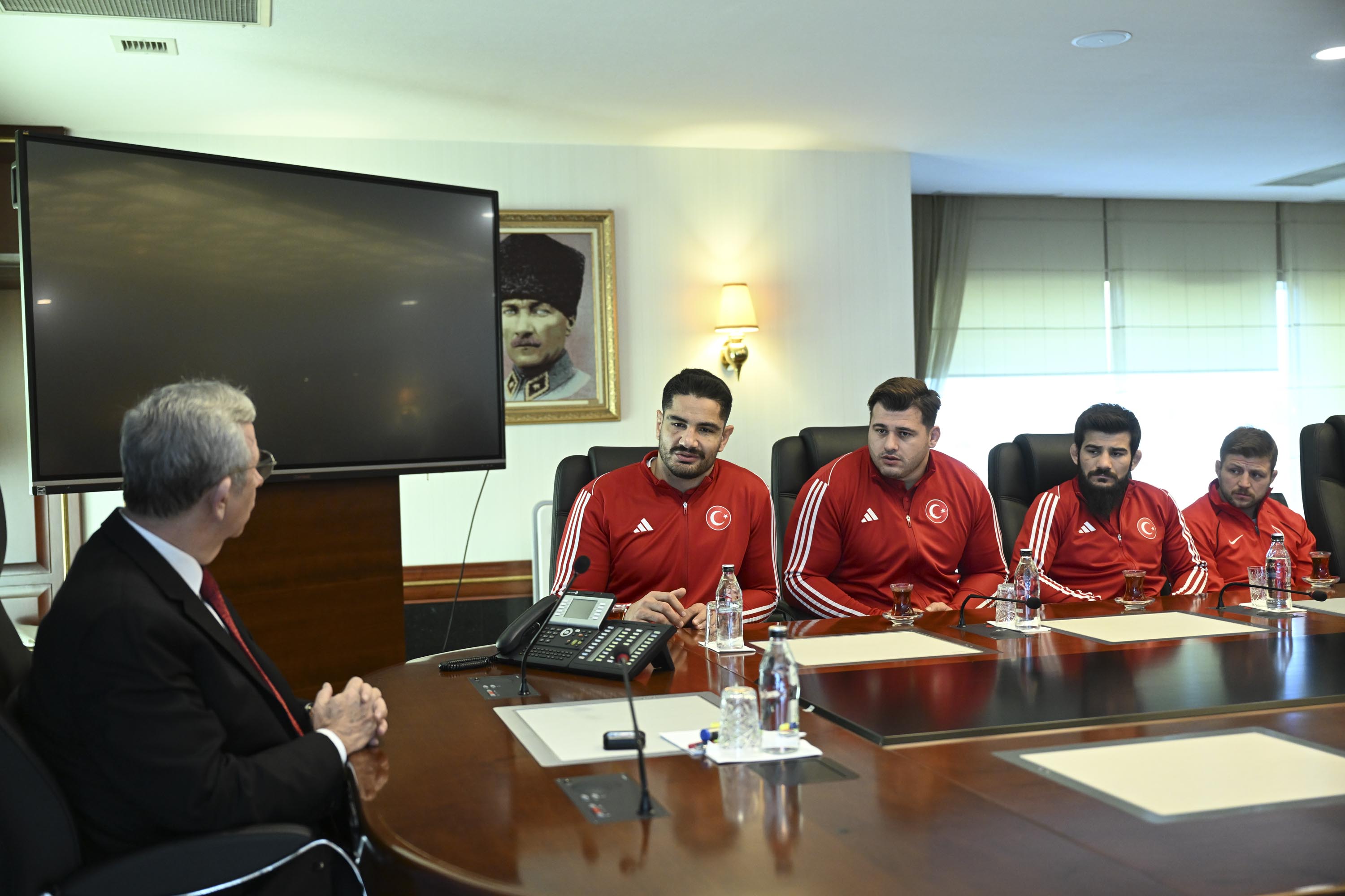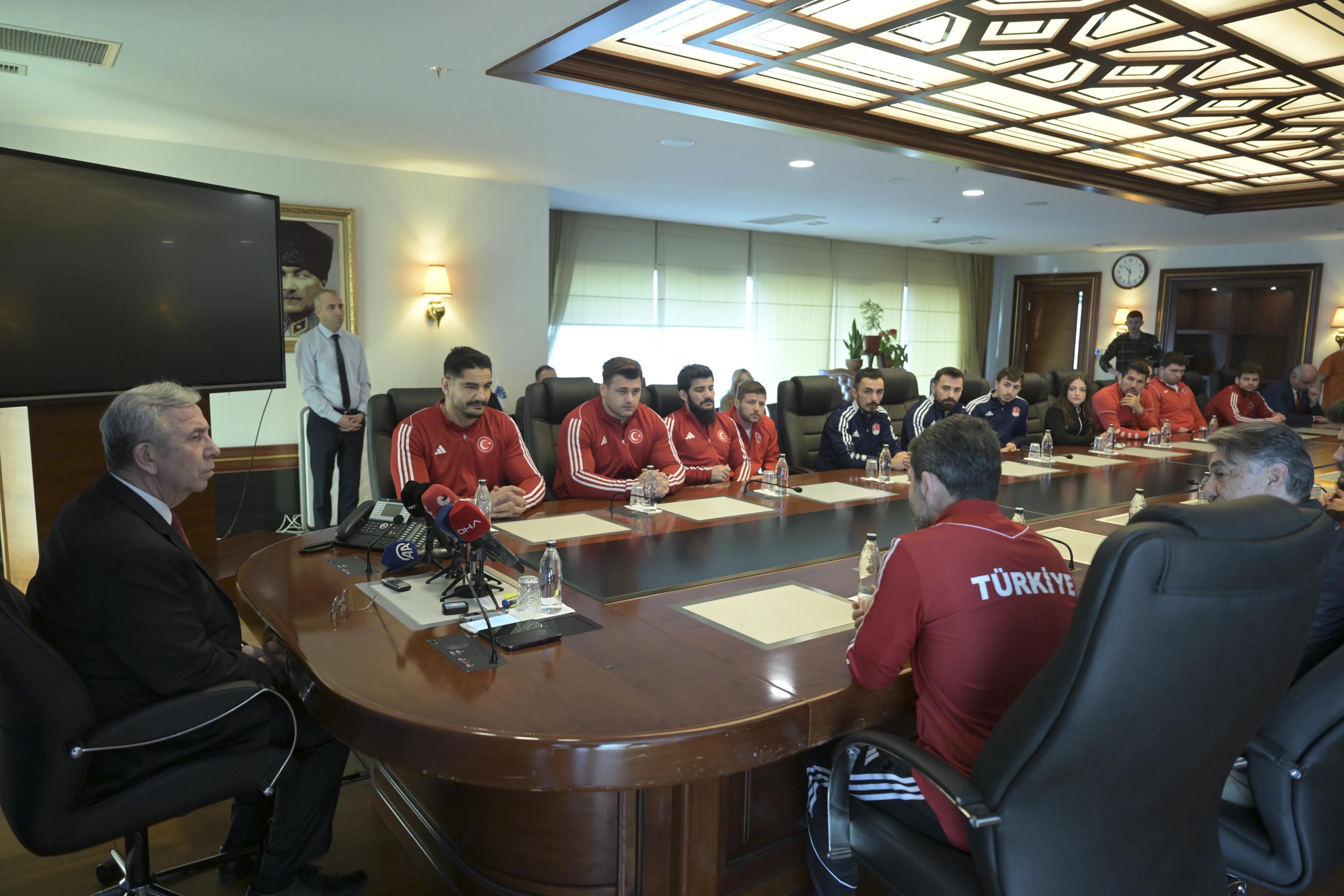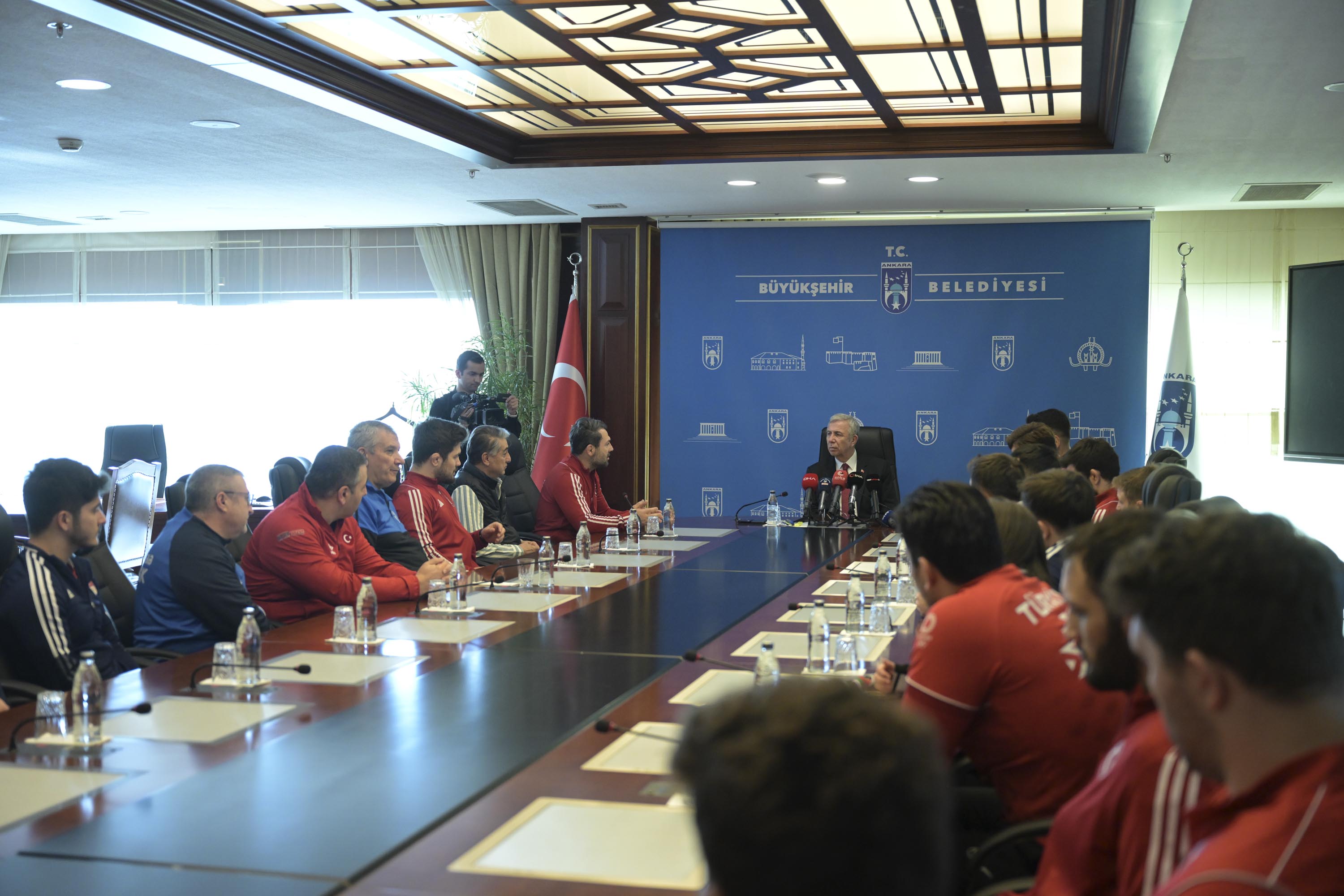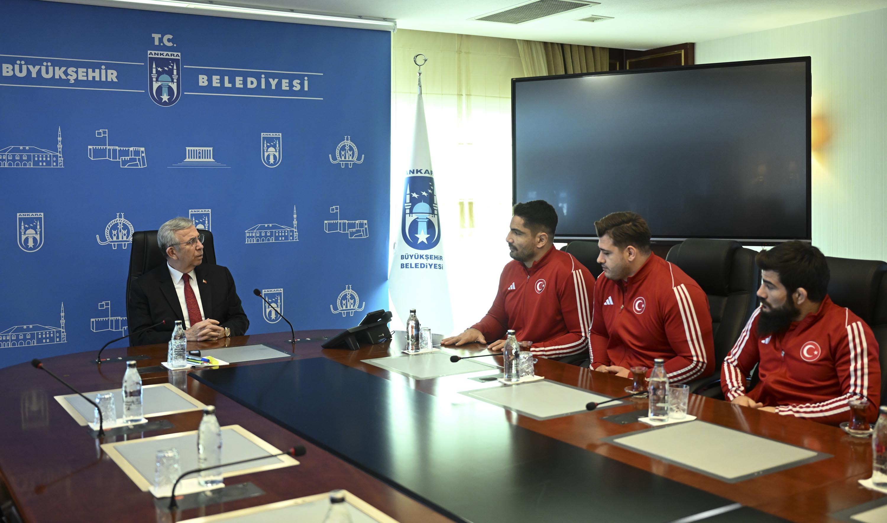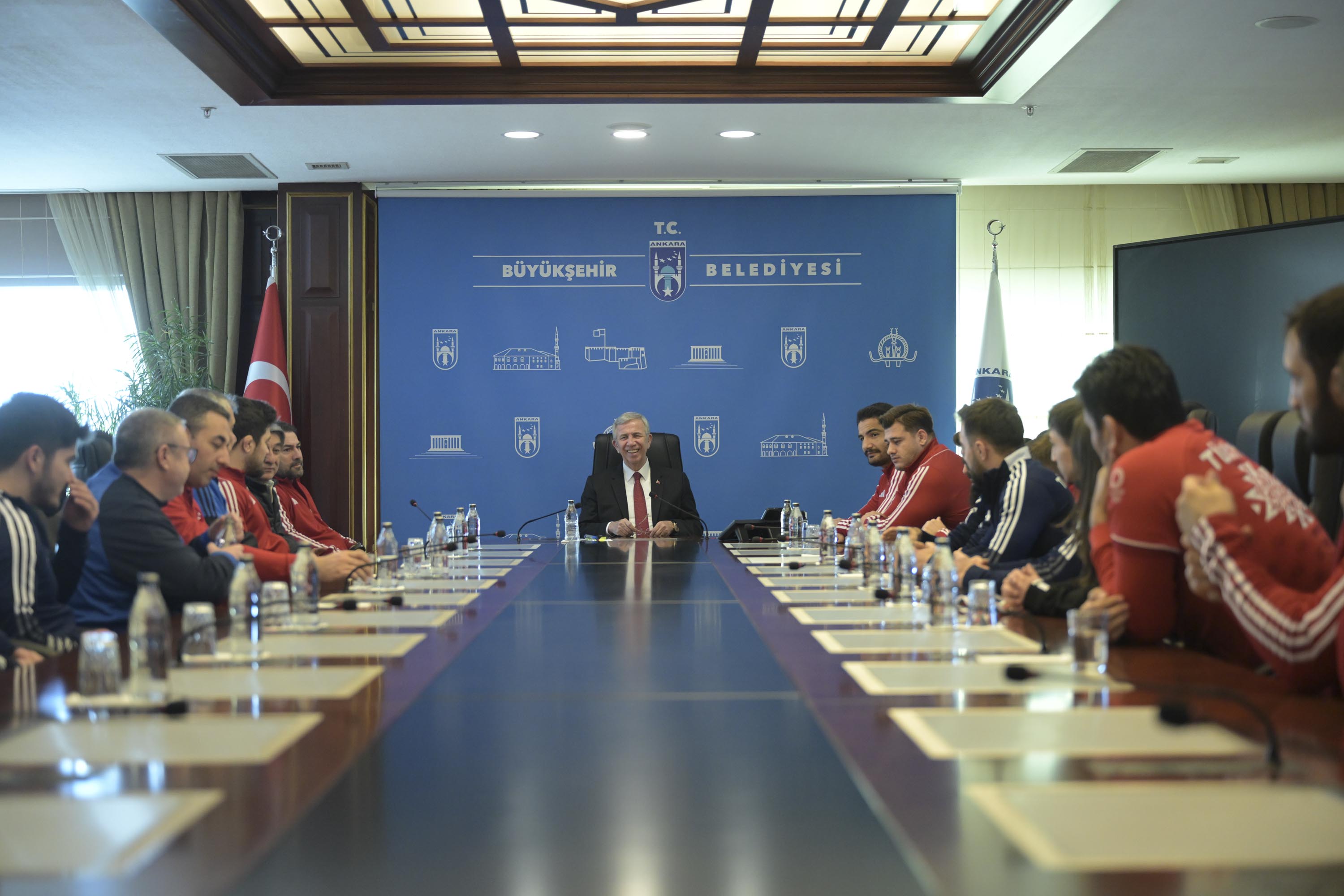 Spora ve sporculara desteklerinin devam edeceğini belirten Yavaş, “Tesis gerekiyorsa tesis…Özellikle mutlaka yeni yetişen gençlerin sayısını da arttırmamız gerekiyor. Onun için çalışmalar aynen devam. Bizim yapacağımız destek olmak, gerisi sizin gücünüze, kudretinize kalmış. Başarılarınızın devamını diliyorum” ifadelerini kullandı. ÇAKMAR: “DESTEKLERİNİZ YOLUMUZU AYDINLATIYOR, BAŞARIYA GÖTÜRÜYOR”ASKİ Spor Kulübü Genel Koordinatörü ve Serbest Güreş Milli Takımı Teknik Direktörü Abdullah Çakmar da sporcular ve teknik ekip adına Mansur Yavaş’a teşekkür ederek şunları söyledi:“Avrupa Şampiyonası’nda hem güreşte hem de halterde çok güzel başarılara imza attık. 31 yıl aradan sonra takım olarak da Avrupa şampiyonluğu nasip oldu. Sizlerin bizlere gösterdiği teveccüh, destek bizim yolumuzu aydınlatıyor, ışık tutuyor ve başarıya götürüyor. Allah razı olsun.”Konuşmasında Takım Kaptanı Taha Akgül’ün final maçından önce ısınırken sakatlandığını aktaran Çakmar, “Isınırken kolu sakatlandı, hem yırtık hem kırık vardı. Orada öylesine bir mücadele verdik ki yenilsek takım şampiyonluğu gidiyordu.Kaptanımız üstüne düşeni yaptı ve takımımız 31 aradan sonra Avrupa şampiyonu oldu. Vatanımız, milletimiz, bayrak sevdası için, İstiklal Marşı’mız için gerçekten ciddi bir mücadele verdik. Altın madalyalarla Ankara’mıza, ülkemize, başkentimize geldik” diye konuştu. ŞAMPİYON SPORCULARDAN YAVAŞ’A TEŞEKKÜRAvrupa Şampiyonası’ndan altın madalya ile dönen Taha Akgül de serbest güreşin Cumhuriyet tarihinde sadece 3 takım şampiyonluğu olduğunu hatırlatarak “Özellikle bu Avrupa Şampiyonası’nda kendi altın madalyamın yanında serbest güreş takımımızın 31 yıl aradan sonra takım halinde Avrupa Şampiyonu olması gerçekten çok büyük bir başarı oldu bizim için.Biz üçüncüyü başardık. Zor olan bir olayı tekrar başarma şansı bulduk. Alnımızın akıyla çıktık bu stresten. Aslında bir altın getirmedim iki altın getirdim ülkeme. 2 kere İstiklal Marşı’mız okundu. Benim ve takımın Avrupa şampiyonluğunun İstiklal Marşı. Bu anlamda çok önemliydi.Ankara Büyükşehir Belediye Başkanımız Mansur Yavaş’ı ziyarete geldik. Kendisi Türk sporuna çok büyük hizmetler veriyor. Yaptığı tesislerle, yaptığı desteklerle… Bugün de bizi makamında kabul etti kendisine madalyalarımızı armağan ediyoruz” diye konuştu. Avrupa Şampiyonası’ndan ikincilikle dönen Rıza Kayaalp ise şunları kaydetti: