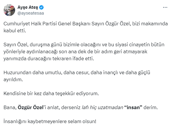 Özgür Özel ile yaptığı görüşme sonrasında sosyal medya hesabından bir paylaşım yapan Ateş, "Cumhuriyet Halk Partisi Genel Başkanı Sayın Özgür Özel, bizi makamında kabul etti."DURUŞMA GÜNÜ BİZİMLE OLACAĞINI SÖYLEDİ"