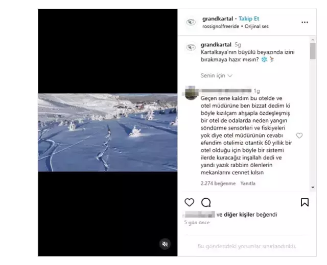 Bolu'da her yıl on binlerce kişiyi ağırlayan Kartalkaya Kayak Merkezi'ndeki Grand Kartal Otel'de çıkan yangında 78 kişi hayatını kaybetti, onlarca kişi yaralandı. Bu, Türkiye tarihinde kayıtlara geçen en ölümcül otel yangınlarından biri oldu.Otelin iç ve dış kaplamalarının ahşap olması yangını hızlandırırken, alarm ve duman dedektörlerinin çalışmaması, yangın merdivenlerinin de içerde bulunması sonucu alev ve yoğun dumana uykuda yakalanan misafirlerin korku ve panik içinde kaçmaya çalışırken hayatlarını kaybetmesine neden oldu.Yangına ilişkin Kültür ve Turizm Bakanlığı ile Boldu Belediyesi arasında yetki tartışmaları da sürerken, 1 yıl önce otelde konaklayan bir misafirin, otel müdürüyle arasında geçen konuşma facianın göz göre göre geldiğini bir kez daha ortaya koydu.Grand Kartal Otel'in Instagram hesabına yorum yazan bir kullanıcı, 1 yıl önce konakladığı otelin müdürüyle arasında geçen diyaloğu paylaştı.