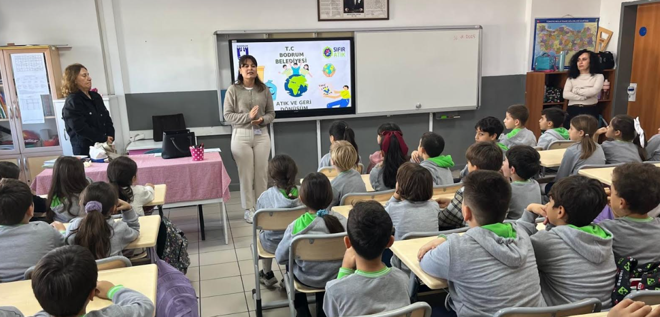Bodrum Belediyesi Temizlik İşleri Müdürlüğü, çocuklarda çevre bilincini geliştirmek amacıyla Sıfır Atık Eğitim Programları düzenlemeye devam ediyor.Program, Temizlik İşleri Müdürlüğü bünyesinde görev yapan çevre mühendisleri ve teknikerler tarafından yürütülüyor. 2025-2026 eğitim-öğretim döneminde üç etap olarak planlanan çalışmaların ilk iki etabında toplam 41 okul ziyaret edilerek 2 bin 650 öğrenciye ulaşıldı.Eğitimlerin son durağı Gündoğan Nafiz Ilıcak İlkokulu oldu. Burada öğrencilerle bir araya gelen ekip, çevrenin korunması, atıkların doğru yönetimi, çevre kirliliğinin önlenmesi ve sürdürülebilir bir gelecek için alınabilecek önlemler hakkında bilgilendirmelerde bulundu.Bodrum Belediyesi, programın üçüncü etabında ortaokul öğrencilerini hedefleyerek toplamda 5 bin öğrenciye çevre bilinci kazandırmayı amaçlıyor.