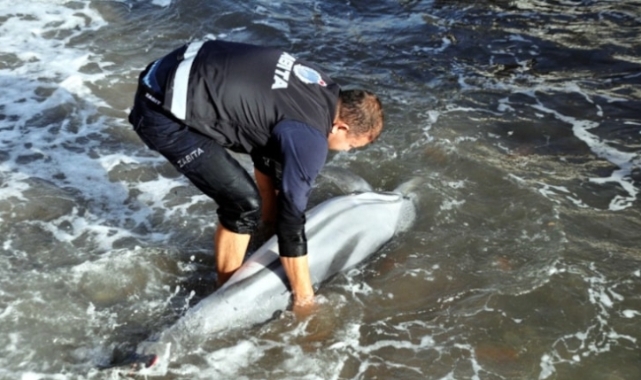 Muğla’nın Bodrum ilçesine bağıl Ortakent Mahallesi’ndeki dünyaca ünlü Camel Beach sahiline bu sabah saatlerinde karaya vuran 2 metre uzunluğundaki dev yunus balığı görenleri şaşkına çevirdi.HER SEFERİNDE GERİ GELDİVatandaşların bulduğu ve canlı olan yunus balığı için belediye ve sahil güvenlik ekiplerinden yardım istendi. Bölgeye gelen belediye ekipleri çok hareketli olan yunusu defalarca itekleyerek denize geri döndürdü. Ancak yunus yaklaşık 100 metre yüzüp açıldıktan sonra tekrar gelip kendini karaya attı.SAATLERCE MÜCADELE ETTİLERÜzerinde herhangi bir yara bulunmayan yunus ekiplerin saatler süren uğraşısı sonunda yüzerek denize açıldı. Bir süre sonra geri gelen yunus belediye ve sahil güvenlik ekiplerinin önünde yaşamını yitirdi."BİLEREK İNTİHAR ETTİ"Yunus denizi girerek kurtarmaya çalışan ve saatlerce mücadele eden Hasan Durmaz “Yaklaşık iki saat uğraştık, üzerinde yara bere yoktu, denize gidip gidip geri geldi, adeta intihar etmeye çalışıyordu, yaklaşık 4 saat uğraştık kurtaramadık, sonunda öldü” dedi.