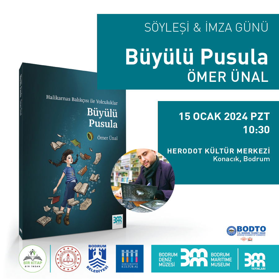 Muğla Valiliği himayesinde Muğla İl Milli Eğitim Müdürlüğünün yürüttüğü "Bir Kitap Bir İnsan" projesi kapsamında Bodrum İlçe Milli Eğitim Müdürlüğü ve Bodrum Deniz Müzesi iş birliği ile müze yayınevimizin ilk çocuk kitabı “Halikarnas Balıkçısı ile Yolculuklar, Büyülü Pusula" kitabımızın yazarı Ömer ÜNAL, Bodrum İlçe Milli Eğitim Müdürlüğüne bağlı okulların öğrencileriyle 15 Ocak 2024 günü saat 10.30’da Herodot Kültür Merkezi’nde buluşacaktır.Bodrum Ticaret Odası (BODTO) destekleri ile kitabı okuyan ve inceleyen 254 öğrenci, etkinlik günü hem yazarla söyleşi gerçekleştirecek hem de kitabını imzalatma şansını yakalayacaktır.Kapalı bir program olarak gerçekleşecek olan etkinliğe siz değerli basın mensuplarımızın katılımlardan mutluluk duyacağız.Saygılarımızla.Etkinlik Bilgileri: