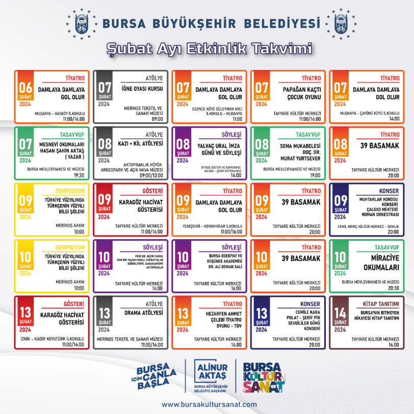 Bursa’da ‘kültür ve sanat herkes için her yerde’ parolası ile kentin kültürel hayatına değer katan Büyükşehir Belediyesi, Şubat ayında gerçekleşecek etkinlikleri içeren takvimi yayımladı.