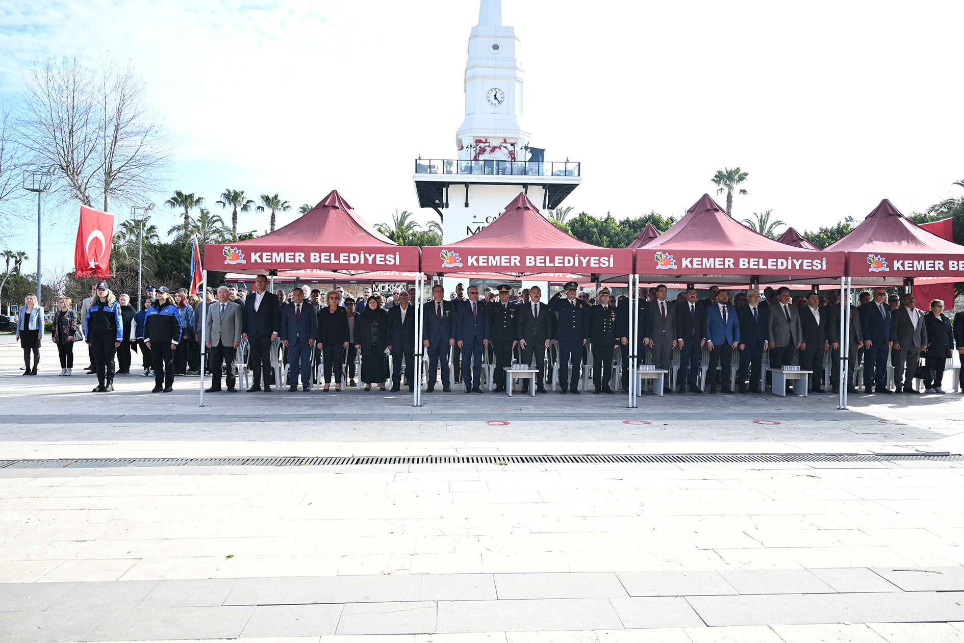 Kemer Cumhuriyet Meydanı’nda düzenlenen törene, Kemer Kaymakamı Ahmet Solmaz, Kemer Belediye Başkanı Necati Topaloğlu, Kemer Cumhuriyet Başsavcısı Gamze Almalı, Kemer Jandarma Komutanı Ömer Seyhan, Kemer Emniyet Müdürü Harun Mere, Kemer Sahil Güvenlik Komutanı Soner Tuna, gaziler ve şehit aileleri, siyasi parti temsilcileri, sivil toplum kuruluşlarının temsilcileri, öğretmenler ve öğrenciler katıldı. Atatürk Anıtı’na çelenk sunumuyla başlayan tören, saygı duruşunda bulunulmasının ardından İstiklal Marşı’nın okunmasıyla sona erdi. Protokol üyeleri daha sonra 18 Mart Çanakkale Deniz Zaferi’nin 109’ncu yıl dönümü dolayısıyla düzenlenen programa katıldı. Kemer Belediyesi Kültür Salonu’nda Hakkı Saygan Hafize Saygan - 3 Ortaokulu tarafından hazırlanan 18 Mart Çanakkale Deniz Zaferi ve Şehitleri Anma programı, saygı duruşunda bulunulmasının ardından İstiklal Marşı’nın okunmasıyla başladı. Hakkı Saygan Hafize Saygan - 3 Ortaokulu Müdürü Erkan Mert, günün anlam ve önemini belirten konuşmasının ardından, Çanakkale Deniz Zaferi konulu şiir, resim ve kompozisyon konulu yarışmalarda dereceye giren öğrencilere ödülleri verildi. Öğrencilerin ödüllerini, Kaymakam Solmaz ile Şehit Komando Er Hasan Yılmaz’ın babası Hüseyin Yılmaz, Belediye Başkanı Topaloğlu ile Şehit Komando Er Hasan Yılmaz’ın annesi Raziye Yılmaz ve Kemer Cumhuriyet Başsavcısı Almalı verdi. Programda, öğretmen ve öğrencilerin hazırladığı Çanakkale destanını anlatan şiirler okundu, oyunlar sergilendi ve türküler söylendi. Program sonrası Kaymakam Solmaz ve Belediye Başkanı Topaloğlu, öğretmen ve öğrencilerle hatıra fotoğrafı çektirdi.