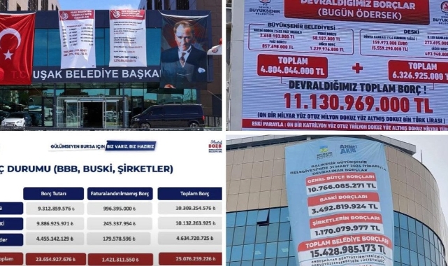 CHP'nin borçla devraldığı belediyeler ise şöyle,Balıkesir: CHP’nin adayı Ahmet Akın yüzde 51,10 oy alarak belediyeyi AK Parti'den aldı. Balıkesir Büyükşehir Belediyesi’nin önceki dönem toplam borcunun 15 milyar 428 milyon 985 bin 173 lira (15.428.985.173 TL) olduğu belediye binasına asılan pankart ile duyurulmuştu. 31 Mart 2024 itibarıyla toplam borç 15 milyar 428 milyon 985 bin 173 TL olarak kayıtlara geçerken, genel bütçe borçlarının 10 milyar 766 milyon 85 bin 271 TL, BASKİ borçlarının 3 milyar 492 milyon 819 bin 924 TL, şirketlere ait borçların da 1 milyar 170 milyon 79 bin 977 TL olduğu belirlendi. Toplam borcun 90 milyon TL’sini ise SGK borcu oluşturuyor.Bursa: CHP’nin adayı Mustafa Bozbey yüzde 47,62 oy alarak belediyeyi kazandı. Bursa Büyükşehir Belediyesi’nin yaklaşık 30 milyar TL olan borcunun 670 milyon TL’sini SGK borçları oluşturuyor.Manisa: CHP’nin adayı Ferdi Zeyrek yüzde 57,18 oranında oyla seçimleri kazandı. Zeyrek, belediyeyi MHP'den 1.2 milyar TL borç ile devraldı. Belediyenin SGK borcu net olarak bilinmezken 31 Mayıs seçimlerine 3 hafta kala belediye AK Parti’deyken 1 milyon lirası kuruyemiş faturası olmak üzere, toplam 416 milyon 587 bin lira harcama yapılmıştı.CHP’NİN AK PARTİ’DEN ALDIĞI İL BELEDİYELERİ