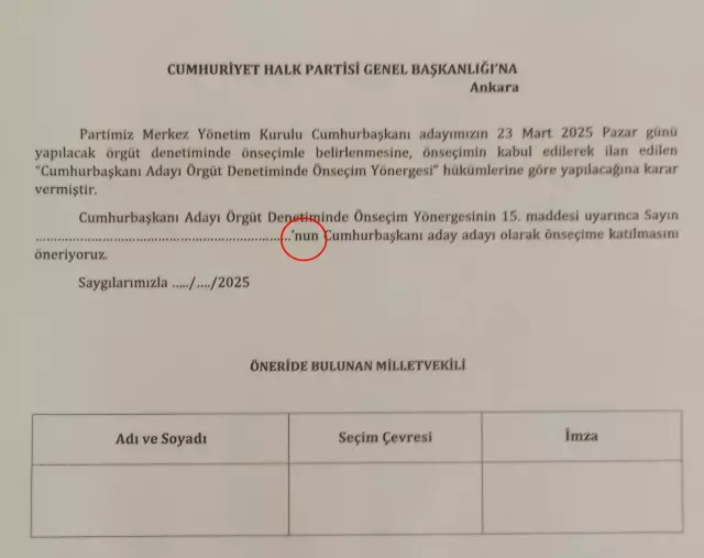 Cumhurbaşkanlığı aday adaylığına yönelik öneri formunda isim yazılacak kısmın "......... ......... 'nun" olarak belirtilmesi, CHP TBMM Grubu'nda yönlendirme yapıldığına dair tartışmaları da beraberinde getirdi.