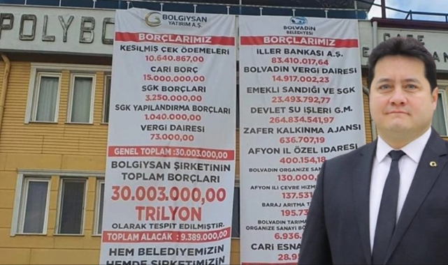 Afyon'daki Bolvadin Belediyesi, AK Parti'den MHP'ye geçti. Yeni Belediye Başkanı Derviş Aynacı, önceki dönemden kalan borçları belediye binasına astı. Afişte kasada 0 TL olduğu ve 424 Milyon 43 Bin TL borç olduğu belirtildi.