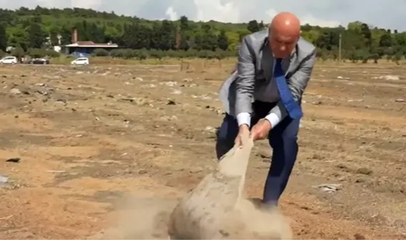 Bir tarım arazisine giden İYİ Parti Balıkesir Milletvekili Turhan Çömez, çiftçinin elinde kalan çok sayıda buğday çuvalını toprağın içinden çıkardı.