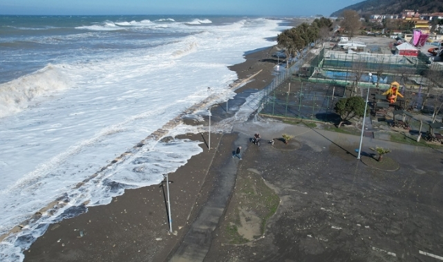 Karadeniz'de 5 metreye ulaşan dalgalar nedeniyle sahil şeridindeki bazı iş yerleri su altında kaldı, kara yolu kum ve taş yığınlarıyla doldu.