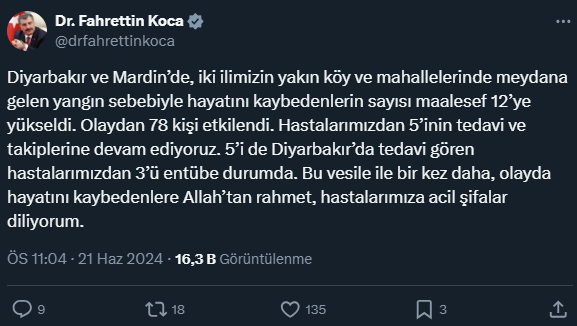 X'teki sosyal medya hesabından paylaşım yapan Bakan Koca, "Diyarbakır ve Mardin'de, iki ilimizin yakın köy ve mahallelerinde meydana gelen yangın sebebiyle hayatını kaybedenlerin sayısı maalesef 12'ye yükseldi. Olaydan 78 kişi etkilendi. Hastalarımızdan 5'inin tedavi ve takiplerine devam ediyoruz. 5'i de Diyarbakır'da tedavi gören hastalarımızdan, 3'ü entübe durumda. Bu vesile ile bir kez daha, olayda hayatını kaybedenlere Allah'tan rahmet, hastalarımıza acil şifalar diliyorum." ifadelerini kullandı.