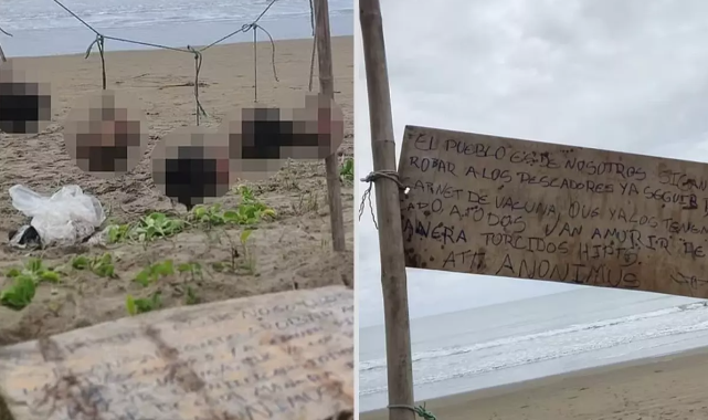 Ekvador'un turistik Puerto López plajında kan donduran bir olay yaşandı. Uyuşturucu çeteleri arasındaki çatışma sonucu 5 insan başı iplere asılı halde bulundu. Ülke tarihinin en kanlı dönemini yaşarken, olay yerinde tehdit mesajları da ele geçirildi.