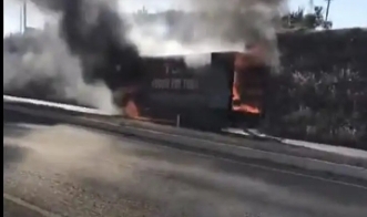Elazığ'da alev alev yanan kamyon, kullanılmaz hale geldi.Olay, Elazığ-Malatya karayolu kapılara mevkiinde meydana geldi. Edinilen bilgiye göre, seyir halindeki kamyon, bir anda alev aldı. Durumu fark eden sürücü kamyonu güvenli noktaya park ederek, araçtan indi. Haber verilmesi üzerine olay yerine itfaiye ekipleri sevk edildi. Ekipler yangını söndürken, kamyon kullanılamaz hale geldi.O anlar vatandaşlar tarafından cep telefonu kamerası ile görüntülendi.Ekipler, yangının çıkış sebebinin öğrenilmesi için çalışma başlattı.