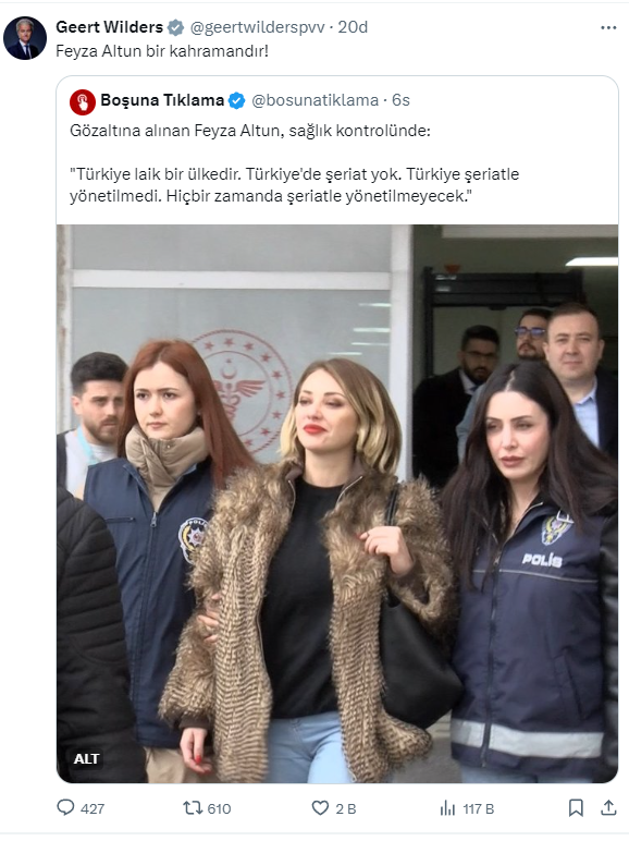 Hollanda'da 22 Kasım'da yapılan erken genel seçimlerinde zafere ulaşan ve yüzde 23,5 oyla 37 sandalye kazanan aşırı sağcı siyasetçi Geert Wilders, Avukat Feyza Altun'un gözaltına alınması hakkında sosyal medya hesabından paylaşımda bulundu. Wilders, tek cümlelik paylaşımında "Feyza Altun bir kahramandır!" ifadelerini kullandı.