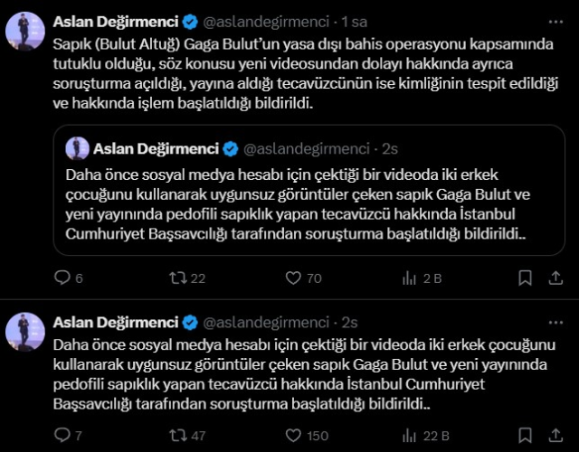 Daha önce sosyal medya hesabı için çektiği bir videoda iki erkek çocuğunu kullanarak uygunsuz görüntüler çeken sapık Gaga Bulut ve yeni yayınında pedofili sapkınlığını itiraf eden şahıs hakkında İstanbul Cumhuriyet Başsavcılığı tarafından soruşturma başlatıldı.