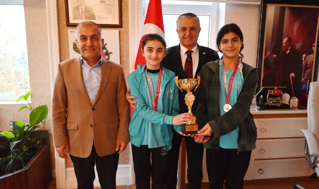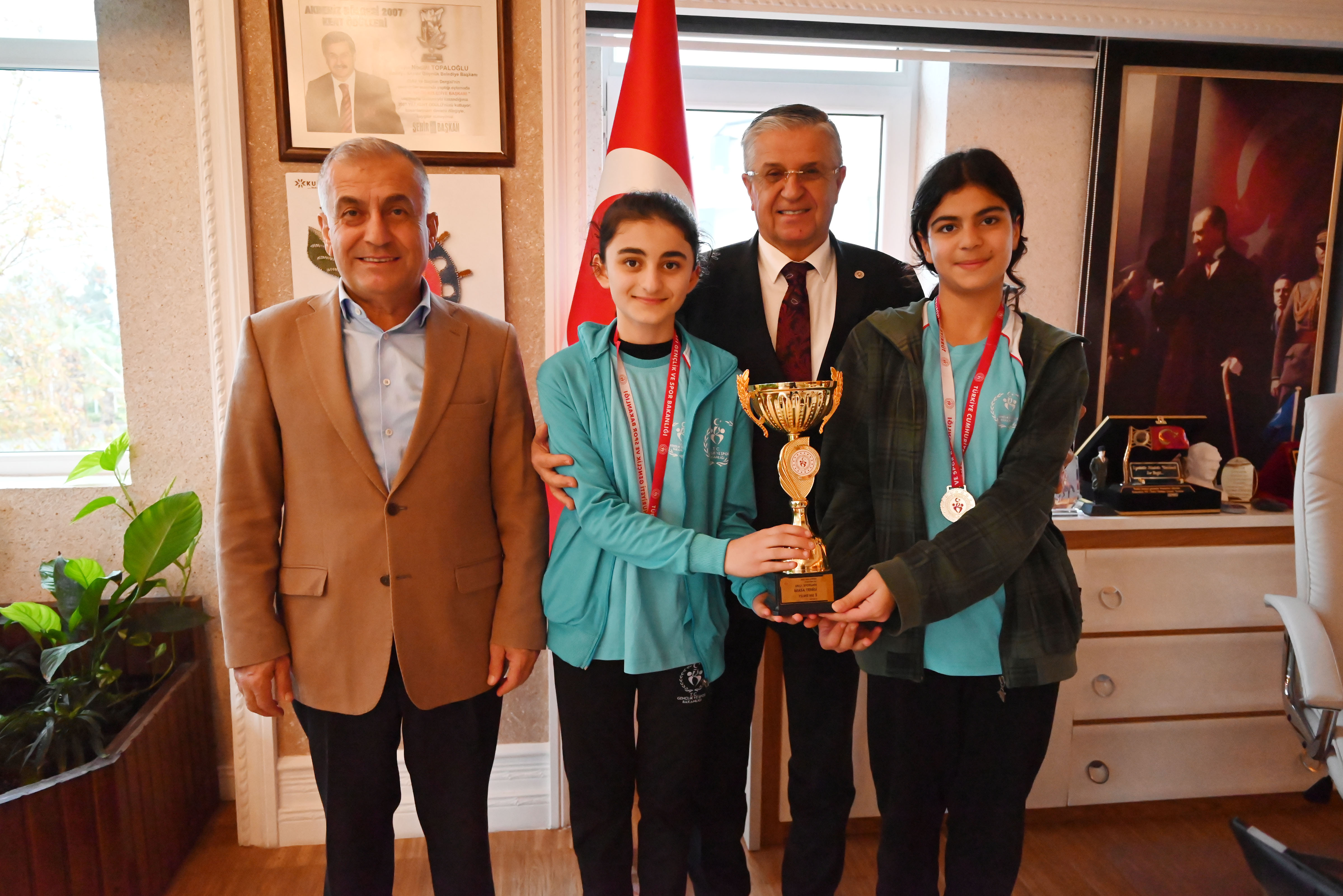 Okul Sporları Masa Tenisi Yıldız Kızlar İl Şampiyonası’na katılan Beldibi Ortaokul öğrencileri Aleyna Aslanoğlu ve Gülçiçek Selim, okul müdürü Erol Öztürk ile Kemer Belediye Başkanı Necati Topaloğlu’nu makamında ziyaret etti.