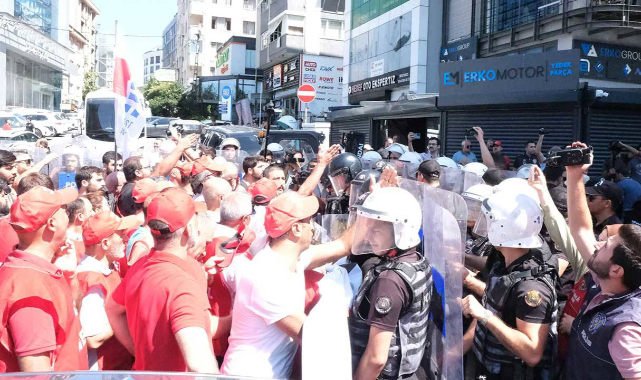 Yurdun dört bir yanında işçi ve emekçiler, hakları için sokaklarda, alanlarda ve meydanlarda olmaya devam ediyor. İnsanca bir yaşam talep eden işçiler, bu uğurda mücadele ederken karşısında polis ekiplerinden jandarma birliklerine kadar devletin tüm zor aygıtlarını buluyor. Patronlar tarafından gasbedilen haklarının hesabını sermayeden soran işçiler, devletin kolluk güçleri aracılığıyla olağanca şiddetle bastırılmaya çalışılıyor.İstanbul Zeytinburnu’nda yer alan Olivium alışveriş merkezindeki CarrefourSA şubesinde eylem yapan işçilere önceki gün polis ve özel güvenlik ekipleri müdahale etti.İşçiler gözaltına alındı. Esenyurt’taki CarrefourSA deposunda çalışan ve 10 Ağustos’ta işten çıkarılan Depo, Liman, Tersane ve Deniz İşçileri Sendikası (DGD-SEN) üyesi emekçiler, ters kelepçe ile gözaltına alındı.Çevik kuvvet ekiplerinin postallarla başlarına ve boyunlarına bastığı işçilerin doğrudan yüzlerine de biber gazı sıkıldı. Bütün bu şiddet sarmalı içerisinde bir polisin, işçilere “Size Sabancı’nın selamını getirdik” demesi ise tepkiyle karşılandı. Darp görüntüleri kamuoyunda tepki yaratırken DGD-SEN de “Sabancı, selamını aldık. Hodri meydan!” dedi.