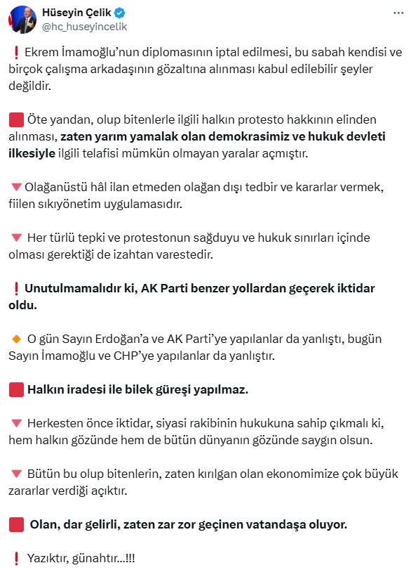 İmamoğlu'nun gözaltına alınmasına dikkat çeken bir tepki de AK Parti kurucularından ve eski Milli Eğitim Bakanı Hüseyin Çelik'ten geldi. X hesabından yaptığı açıklamada Çelik şu ifadeleri kullandı; "Ekrem İmamoğlu'nun diplomasının iptal edilmesi, bu sabah kendisi ve birçok çalışma arkadaşının gözaltına alınması kabul edilebilir şeyler değildir."TELAFİSİ MÜMKÜN OLMAYAN YARALAR AÇMIŞTIR"