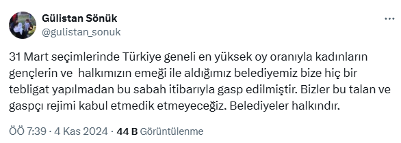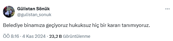 Gülistan Sönük ilerleyen dakikalarda ise sosyal medya hesabından "Belediye binamıza geçiyoruz hukuksuz hiç bir kararı tanımıyoruz" mesajı paylaştı.