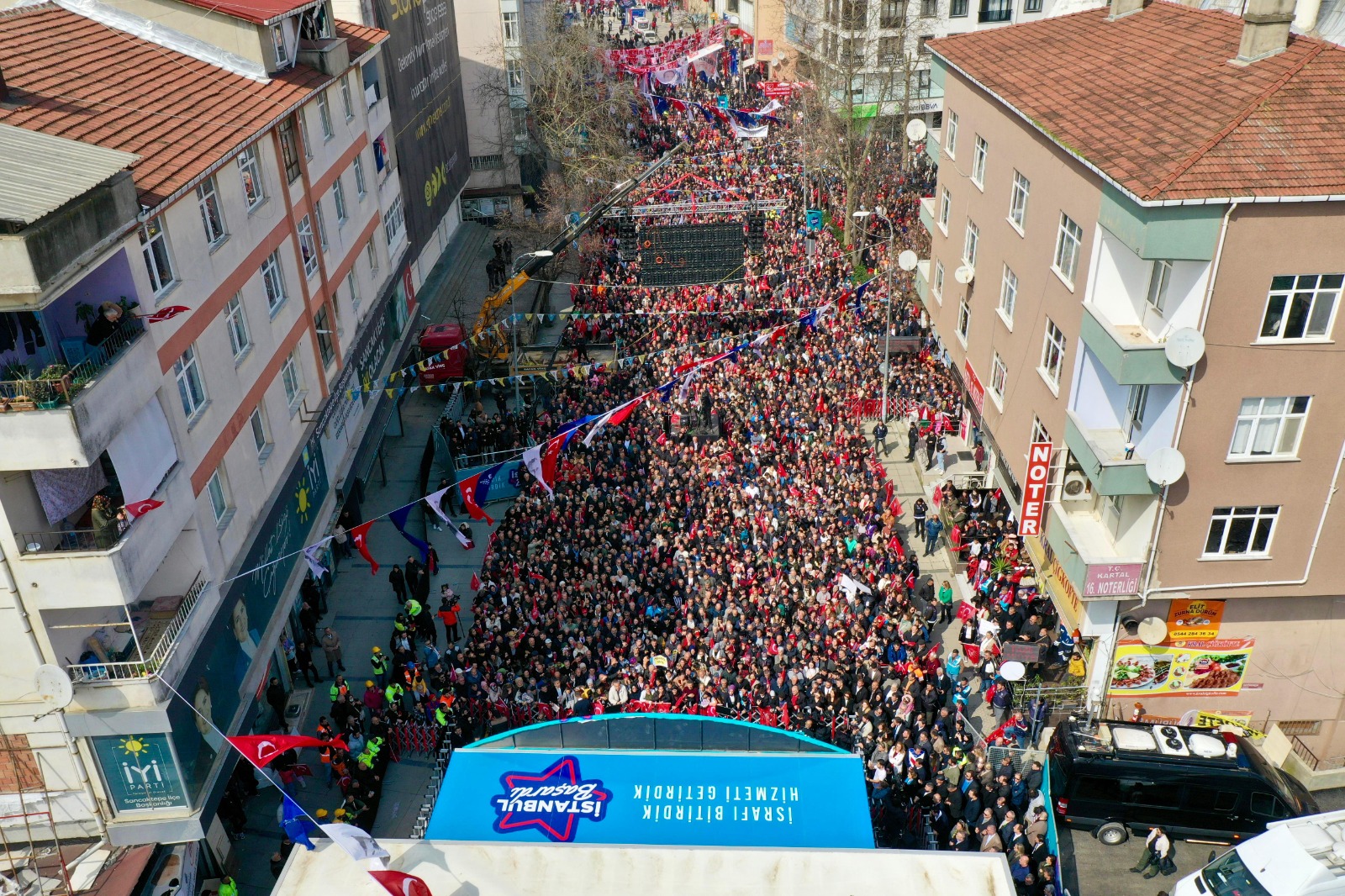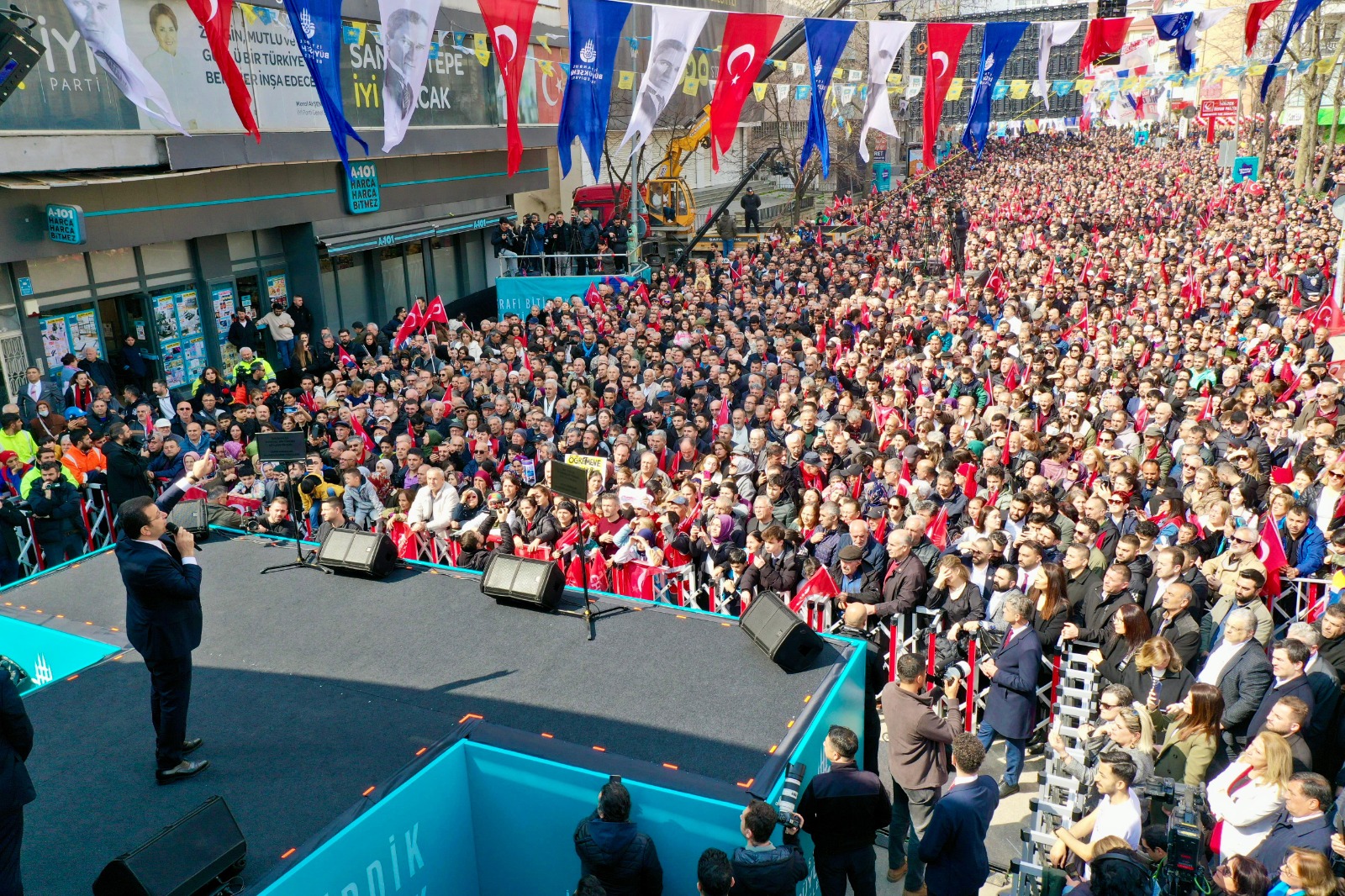 “ELİNE YÜCE KURAN'I ALIP, ONUNLA SİYASET YAPANI ALLAH ISLAH ETSİN”İmamoğlu’nun konuşmasının bu noktasında, elinde Kur’an-ı Kerim bulunan yaş almış bir kadın vatandaş, provokasyon girişiminde bulundu. Alanı dolduran vatandaşların tepkisini dindiren ve sakin olmaya davet eden İmamoğlu, provokasyon girişimine, “Bana hediye etmek istersen alırım Kur'an-ı Kerim'i senden.Tamam. Sakin, sakin. Ablamız, aldanmış bir ablamız. Ablamız aldanmış bir ablamız. Sakin, sakin. Elinde Kur’an-ı Kerim'le iftira atmak, günahların en büyüğü. Allah ona yardım etsin. Allah ona yardım etsin. Mübarek Ramazan ayında, Allah ona yardım etsin. Sakin, sakin, sakin.Şimdi bu arkadaşlar, bunun gibi ablalarımızı bile aldattılar. Onları bile mahvettiler. Eline Yüce Kuran'ı alıp, onunla siyaset yapanı Allah ıslah etsin, Allah ıslah etsin. Ama onlar aldanmış. Biz onları da kurtaracağız, onları da. Bu millet onları da kurtaracak. Onlar aldanmış zavallılar. Allah yardım etsin ona ne diyeyim” sözleriyle tepki gösterdi. “İBB’NİN YÜKLENİCİLERİNE, BİZ GELDİĞİMİZDE TAM 70 MİLYON EURO BORCU VARDI”10 metro inşaatının, 2017-19 yılları arasında, farklı zaman dilimlerinde durdurulduğunu aktaran İmamoğlu, “Bitirdiğimiz her metro projesine, ‘Biz başlattık’ diye sahip çıkıyorlar. Gerçeğin tamamını söylemiyorlar. ‘Doğru, biz başlattık, ama kısa süre sonra hepsinin kapısına kilit vurduk’ diyemiyorlar.Bakın; biz göreve gelene kadar, metro inşaatlarında çalışma varmış gibi bir izlenim vermeye çalışıyorlar. Yalancının, pişkinliğin bu kadarına, İstanbulluya yapılan bu büyük haksızlığa siz ne yapacaksınız biliyor musunuz? Bu işin sahibi, buraya harcanan her kuruşun, her paranın sahibi olarak, sandıkta ceza keseceksiniz, ceza. Bakın; böyle sorumsuz, böyle iş bilmez, böyle had bilmez bir akla, İstanbul bir daha teslim edilemez” diye konuştu.Başlatılıp durdurulan çoğu metronun projesinin dahi bulunmadığına dikkat çeken İmamoğlu, “Bazılarında sadece ihale vardı biliyor musunuz? Başka hiçbir şey yoktu. Şantiye bile yoktu. Bakın hiçbirinin finansal altyapısı oluşturulamamıştı. İBB’nin yüklenicilerine, biz geldiğimizde tam 70 milyon Euro borcu vardı. Çekmeköy-Sancaktepe-Sultanbeyli ve diğer hatlar, işte bu yüzden durdurulmuştu. Belediyenin, metro yapımı için ödeyecek 5 kuruş parası bile yoktu. İBB'nin metro bütçesi iflas etmişti” bilgisini paylaştı. “VATANDAŞTAN GİZLEYİP, ALGI YAPMAYA ÇALIŞTIKLARI GERÇEK BUDUR”“İşte söylemedikleri, ısrarla vatandaştan gizleyip, algı yapmaya çalıştıkları gerçek budur” diyen İmamoğlu, “İşin bir başka yönü daha var. Bir başka ürkütücü yönü daha var. Yarım bıraktıları, böyle apar topar terk edilen şantiyelerde, ne yazık ki bu projenin tünelleri çökme riskiyle karşı karşıyaydı. Çünkü açılan birçok tünelin betonla güçlendirilme işlemleri bile yapılmamıştı.Bu durumda olan 40’a yakın tünel vardı İstanbul'da. Arkadaşlarım, bunların her birisini tespit etmişti. Her an çökme riski taşıyan 40 tünelle işleri paydos edip, ortadan kayboldular. Ve yüklenicileri, şantiyeleriyle baş başa bıraktılar. Biz geldik… Bütün finansman sorunlarını biz çözdük, biz. Bütün mühendislik eksikliklerini, proje gruplarıyla, yüklenicilerle oturup, aynı masada birlikte çözdük, giderdik. Ve aynı anda 10 metro hattı inşaatını gururla paylaştık, gururla” ifadelerini kullandı. “BİZİM YAPTIĞIMIZ 65 KİLOMETREYİ, SÖZÜM ONA 8 KİLOMETRE GİBİ GÖSTERME TELAŞINA DÜŞTÜLER”10 metro inşaatına başladıkları süreçte İBB Meclisi ve imza yetkisi olan bakanlıklar tarafından engellendiklerinin altını çizen İmamoğlu, şunları söyledi: