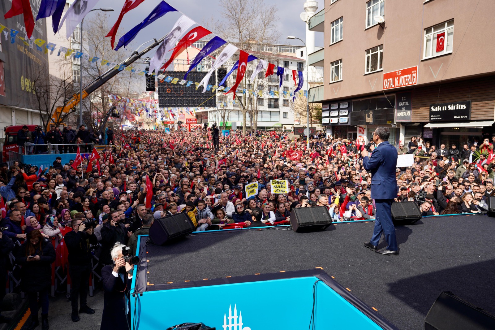“İBB’yi ilk alacağımız anlaşıldığında, panik halinde yollara döküldüler. Dediler ki; ‘Eğer CHP kazanırsa, İSPARK'ı filanca terör örgütüne verir.’ Ama o günden bugüne hem İSPARK’ta hem bütün iştiraklerimizde ne kimsenin ekmeğine dokunduk ne ayrımcılık yaptık.Liyakate göre, gencecik insanları hangi siyasi görüşten olursa olsun, neye inanırsa inansın, nasıl giyinirse giyinsin ayırmadan, İstanbullu olmanın, bu memleketin bir evladı olmanın dışında hiç başka bir kritere bakmadan, Ekrem Başkan aldı, çalıştırdı ve büyük İstanbul hikayesini bu yüce gönüllülüğüyle, bu sevgisiyle başardı. 5 yıl önce İBB’de kreş yoktu. Çünkü onların ‘kadın’ diye bir derdi yoktu.Kadın evde oturacak, çocuk bakacak, hasta bakacak, engellisine bakacak ve yeri ev olacaktır. Oysa biz, kadının sosyal hayata katılmasını, çalışma hayatına katılmasını istiyorduk. Ekrem Başkan, İstanbul'da tam 100 tane ve Türkiye'de CHP’li belediyeler 300 tane kreş yaparak kazandırdılar. Şimdi anneler, güvenerek çocuklarını bırakacakları kreşlere sahipler.Türkiye'nin dört bir yanından İstanbul'a öğrenciler geliyor. Barınma sorunu var. Türkiye'de yüzde 24 öğrenciye yurt verilebiliyor. İstanbul'da rakam çok daha aşağılarda, yüzde 10’larda. Yani devlet öğrenciyi buraya yolluyor ama barınma sorununu çözmüyor. Ekrem Başkan’a yetkiyi verdiğinizde, İstanbul'da öğrenci yurdu yoktu.Niye? Öğrenciler, yurt bulamayacaklar, onlara yurt veren birilerine gidecekler. Birtakım cemaatlerin, birtakım tarikatların yurduna gidecekler. Oysa bu evlatlar, hepimizin evlatları. Ekrem Başkan İstanbul'da 14 tane, CHP'li belediyeler Türkiye’de 61 tane yurt yaptılar. Yurt yapmaya da kreş yapmaya da annelere de evlatlarını da sahip çıkmaya devam edeceğiz.”“ATANAMAMIŞ DEĞİL TAYYİP ERDOĞAN’IN SAHİP ÇIKMADIĞI ÖĞRETMENLER VAR”Meydanda pankart açarak seslerini duyurmaya çalışan atanamayan öğretmenlerin sorunlarına da dikkat çeken Özel, “Diyorlar ki ‘Biz, devletin sözüne inanamayacak mıyız?’ Geçen seçimlerden önce çıktılar, ‘Mülakatı kaldıracağız’ dediler. Şimdi mülakatı kaldırmıyorlar. AK Parti'ye oy vermek yetmez, hatta üye olmak yetmez; torpilli AK Partilileri mülakatta alıyorlar, vatandaşın çocuklarını eliyorlar.Öğretmenlere mülakatsız atama istiyoruz. Göreve atanmamış öğretmenlere diyoruz ki; bunlar size sahip çıkmayacaklar.’ Size ‘atanamayan öğretmen’ diyorlar. Öğretmenin ne günahı var da atanamamış? Atanmayan öğretmen, Tayyip Erdoğan'ın sahip çıkmadığı öğretmen, Tayyip Erdoğan'ın mülakatla elediği öğretmen, ayrımcılık yaptığı öğretmen var” diye konuştu. “EMEKLİLERİN CEBİNDEKİ 5.5 ÇEYREK ALTIN SEÇİM SANDIĞINDA KAYBEDİLDİ”Yerel seçime 15 gün kaldığını hatırlatan Özel, “Büyük bir zafer, büyük bir başarıya doğru adım adım gidiyoruz. Meydanlar dolu, heyecanlı, meydanlar sabırsız. Bu ülkede büyük bir ekonomik kriz yaşanıyor. Büyük sorunlar yaşanıyor” dedi. Emeklilerin yaşadığı ekonomik krize dikkat çeken Özel, en düşük emekli maaşı olan 10 bin lirayı alan vatandaşları, “Türkiye’nin en büyük korosu” olarak niteledi.“AKP iktidara geldiğinde en düşük emekli maaşı tam 8 sekiz çeyrek altın alıyordu” diyen Özel, “Bugün 10 bin lira, 2.5 çeyrek altın alabiliyor. Emeklilerin cebinden her ay 5.5 çeyrek altın kayboluyor. Ey emekliler, değerli büyüklerim; 5.5 buçuk çeyrek altını düşürdüğünüzü, kaybettiğiniz yerde arayın.Bir altın kaybedilse geçtiğiniz yolda ararsınız. Siz 8 çeyrek altınlık emekli maaşı alıyorken, bu 2.5’e indiyse, bunu siz bir seçim sandığında kaybettiniz. Recep Tayyip Erdoğan'ın geldiği, Adalet ve Kalkınma Partisi'nin geldiği seçim sandığı, sizin cebinizden aylık 5.5 çeyrek altına aldı. Kaybedilen şey, yitirildiği yerde aranır. O zaman madem sandıkta kaybettik, hakkımızı sandıkta arayacağız” ifadelerini kullandı. ÖZEL’DEN İMAMOĞLU’NA: “İSTANBUL İTTİFAKI’NIN MİMARI, İSTANBUL İTTİFAKI’NIN EVLADI”“Konuşmasının sonunda seçmene ittifak çağrısı yapan Özel, şunları söyledi: