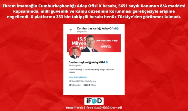 İstanbul Büyükşehir Belediye Başkanı Ekrem İmamoğlu'nun Cumhurbaşkanlığı Aday Ofisi'ne ait sosyal medya platformu X'teki (eski adıyla Twitter) hesabı, "milli güvenlik ve kamu düzeninin korunması" gerekçesiyle erişime engellendi.Alınan bilgiye göre, söz konusu erişim engelleme kararı internet servis sağlayıcılarına iletildi. Ancak X platformunun, söz konusu hesabı Türkiye'den erişimde henüz görünmez hale getirmediği öğrenildi.Karar, sosyal medyada ve siyasi çevrelerde tartışma konusu olurken, konuya ilişkin resmi bir açıklama henüz yapılmadı.