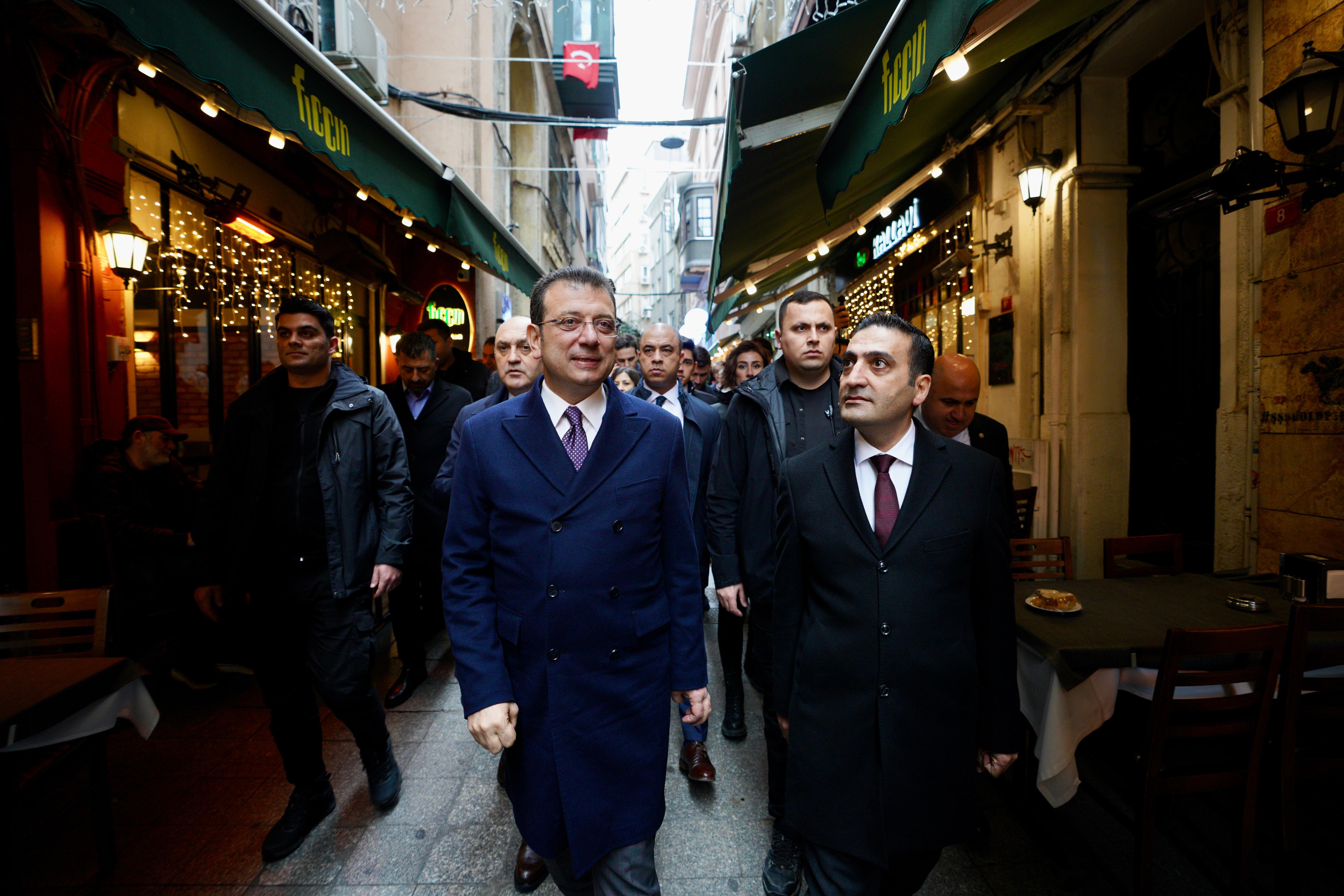 ŞUNLAR, BUNLAR GELİR GEÇER; MİLLETÇE BİRBİRİMİZİ SEVELİM”İmamoğlu, “14 Şubat Sevgililer Günü” mesajını da sevgililerin uğrak mekanı İstiklal Caddesi’nden cep telefonu üzerinden yapılan canlı yayınla verdi: “Beyoğlu bugün Sevgililer Günü'nün ışıltısını taşıyor. Çok güzel hanımefendiler, çok yakışıklı beyefendiler, güzel buluşmalarla sevgililer gününü yaşayacaklar. Bütün İstanbul'un birbirini sevmesini, tabii ki Beyoğlu'nun da birbirini sevmesini istiyoruz. Aynı şekilde bütün Türkiye'nin birbirini seven, birbirine saygı duyan bir toplum olmasını istiyoruz.Seçimler, şunlar, bunlar gelir geçer. Milletçe birbirimizi sevelim. Sevgi dolu insanlarımız var. Aranıza ne olur nifak sokmayın. Aranıza yalan sokmayın. Aranıza ön yargıları sokmayın. Aranıza empatiyi koyun. Birbirinizi düşünmeye gayret edin. Bugün İliç'te canımız yandı. İliç için üzülelim. Ama milletçe birbirimizi sevelim.Acıları beraber paylaşarak azaltalım, birlikte paylaşarak büyütelim. Güzel bir gelecek hem İstanbul'u hem Beyoğlu'nu hem bütün Türkiye'yi bekliyor. Kocaman, sevgi dolu selamlar İstanbul'daki bütün hemşehrilerimize.”GURBETÇİ VATANDAŞTAN İMAMOĞLU’NA: “BU ÜLKENİN SİZE İHTİYACI VAR”İmamoğlu, İstiklal Caddesi’ni gezen turistlerin de ilgi odağı oldu. Yurt dışında yaşadığını belirten bir vatandaş da imamoğlu’na, “Ben bu şehirde yaşamıyorum. Bu şehri bilmiyorum ama bu ülkenin size ihtiyacı olduğunu biliyorum. Bunu bütün samimiyetimle söylüyorum. Neden biliyor musunuz?Ben, 10 yıl önce bu şehirde, bu ülkede yaşıyordum. Dün bu ülkeye tekrar yeniden geldim. Ülke bitmiş. Bunu siyaset olsun diye söylemiyorum. Gerçekten de size ihtiyaç var. Kendinize iyi bakmanızı istiyorum” sözleriyle seslendi. İKİNCİ ADRES: OKMEYDANIİstiklal Caddesi’nden Okmeydanı’na geçen İmamoğlu ve Güney’in ikinci adresi, Kaptanpaşa Mahallesi Fatih Sultan Minberi Caddesi oldu. Mahalle halkı tarafından sevgi gösterileriyle karşılanan İmamoğlu ve Güney, yoğun ilgi altında zorlukla da olsa esnaf ziyaretlerini gerçekleştirdi. Bir tostçu dükkanına giren İmamoğlu, esnaf ve müşterilerle sohbet etti. Ziyarete, bir müşterinin İmamoğlu’na söylediği şu sözler damga vurdu: “EŞİME YÜZÜĞÜ BÜYÜKŞEHİR’DEN ALDIĞIM PARAYLA ALDIM”“Seçimi kazandığınızdan beri, zamanında topal ördek dediler size. ‘Seçilse bile topal ördek olacak’ dediler. Seçildiniz; bu kez, ‘Bir iş yapmıyor’ dediler. Fakat yaptınız. Ben evlendim, evlilik yardımı aldım. Fakat Beyoğlu Belediyesi’ne nikah ücreti ödedim, Büyükşehir Belediyesi yardım verdi. Ben, eşime yüzüğü Büyükşehir’den aldığım parayla aldım. Yani bunları ben gördüm. Allah razı olsun sizden.Şehidimiz de vardı bizim Pençe-Kilit’te. Baktım Sayın Kılıçdaroğlu’nun gönderdiği çelenkleri parçaladılar. Basına baktım, ‘Çelenkleri parçaladılar…’ Biz yapmadık. Şehidin babası da rahatsız oldu bu durumdan. Yapanları buldum ben. ‘Niye yaptınız, ayıp. Bizim herkese kapımız açık.Biz CHP’li değiliz, AK Parti’li de değiliz. Fakat niye çelenkleri parçaladınız’ dediğimde, ‘Ya onlar işte şunla, bunla bir…’ ‘Ya geçin onları’ dedim, Bu ülkede CHP’lide şehit var, AK Parti’lide şehit var. Biz aynı vatanın evladıyız. Ülkeyi böyle kutuplaştırdılar. Bu dönemde de ben, Büyüşehir’de size oy vereceğim. Aileme de eşime de söyledim.” GENÇLERDEN İMAMOĞLU’NA: “İNŞALLAH BİZİM GİBİ İSTANBUL YİNE KAZANACAK”İmamoğlu’nun vatandaşa yanıtı, “İnşallah mahcup olmayız. Ailene sevgilerini ilet. Allah mutlu etsin” oldu. Bir grup genç de bir anda karşılarında gördükleri İmamoğlu’na, “Kütüphaneler için çok teşekkür ederiz. Üniversite sınavına sizin hazırladığınız kütüphanelerde çalıştık, kazandık.Vize ve finaller yine hep orada çalışıyoruz. İnşallah bizim gibi İstanbul yine kazanacak. Çok mutluyuz. Arkanızdayız. Allah yolunuzu açık etsin” sözleriyle teşekkürlerini sundu. İmamoğlu da gençlere, “Ne hoş. Teşekkürler” karşılığını verdi.İmamoğlu’yla fotoğraf çeken bir başka genç de “İlk resim, ilk oy Başkanım. Doğru mu” diyerek, vereceği oyun rengini belli etti. İmamoğlu’nun gence yanıtı, “Ne mutlu bana” oldu.Yol üstündeki AK Parti seçim bürosunu ziyaret etmeyi de ihmal etmeyen İmamoğlu, ellerini sıktığı görevlilere, “Sağlıklı, sıhhatli bir mücadele olsun inşallah. Gürültüsüz, sevgiyle, saygıyla, herkesin becerisiyle kendini anlattığı bir seçim olsun” temennisinde bulundu.