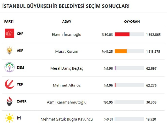 2019'DA HANGİ PARTİ NE KADAR OY ALMIŞTI?2019 yılında yapılan seçimlerde 31 Mart yapılan İstanbul Büyükşehir Belediye Başkanlığı için yapılan seçimi iptal edilmişti. 23 Haziran 2019'da tekrarlanan seçimlerde CHP'nin adayı Ekrem İmamoğlu 4 milyon 741 bin 870 oy ile seçmenin yüzde 54,21'nin oyunu alarak İBB Başkanı seçildi. Rakibi AKP-MHP'nin ortak adayı Binali Yıldırım ise 3 milyon 935 bin 444 ile oyların yüzde 44.99'unu almıştı.