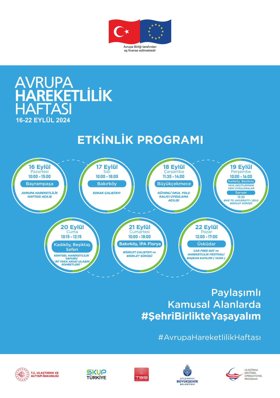 Kadıköy ve Beşiktaş’ta yaya geçitlerine renkli desenler yapılacak. Bu desenler, yükseltilmiş yaya geçidi etkisi yaratarak dikkatli sürücüler ve güvenli geçişler sağlayacak. Ayrıca, 15:30-17:00 saatleri arasında, üniversite öğrencileri ve akademik personel için “Bike to University” bisiklet sürüşü gerçekleştirilecek. Bisiklet sürüşü, Sarıyer Şehir Hatları Emirgan İskelesi'nden başlayarak İTÜ Ayazağa Kampüsü’nde son bulacak.20 Eylül 2024, Cuma: Kentsel Hareketlilik Vapuru