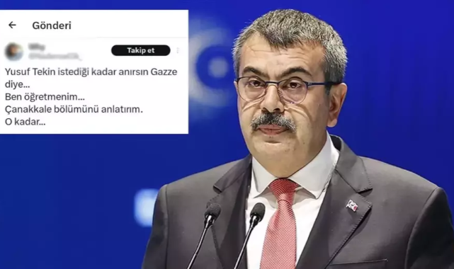 Öğretmen olduğunu iddia eden X kullanıcısı, "Yusuf Tekin istediği kadar anırsın Gazze diye. Ben öğretmenim. Çanakkale kısmını anlatırım. O kadar..." paylaşımını yapmıştı. Paylaşımın çok konuşulunca, o kullanıcı Bakan Tekin'den özür diledi. Tekin, o özrü alıntılayarak, "Estağfirullah hocam. Hepimiz insanız. Allah yolunuzu açık etsin, yardımcınız olsun..." şeklinde karşılık verdi. Tekin'in cevabının ardından o kullanıcı hesabını kapattı. Kaynak:Haberler.com