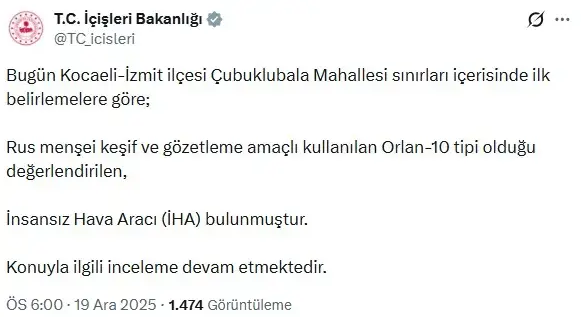 Kocaeli'nin İzmit ilçesinde arazide bulunan ve vatandaşlar arasında paniğe neden olan İansız Hava Aracı (İHA) ile ilgili beklenen açıklama geldi. İçişleri Bakanlığı, olay yerinde inceleme yapıldığını belirterek hava aracının menşeyini duyurdu. Rusya detayı dikkat çekti.