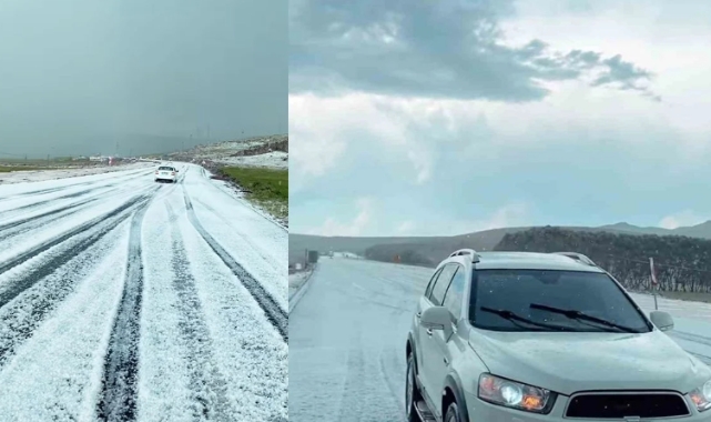 Ardahan'da dolu yağdı. Aniden bastıran dolu sonrası yollar beyaza büründü.