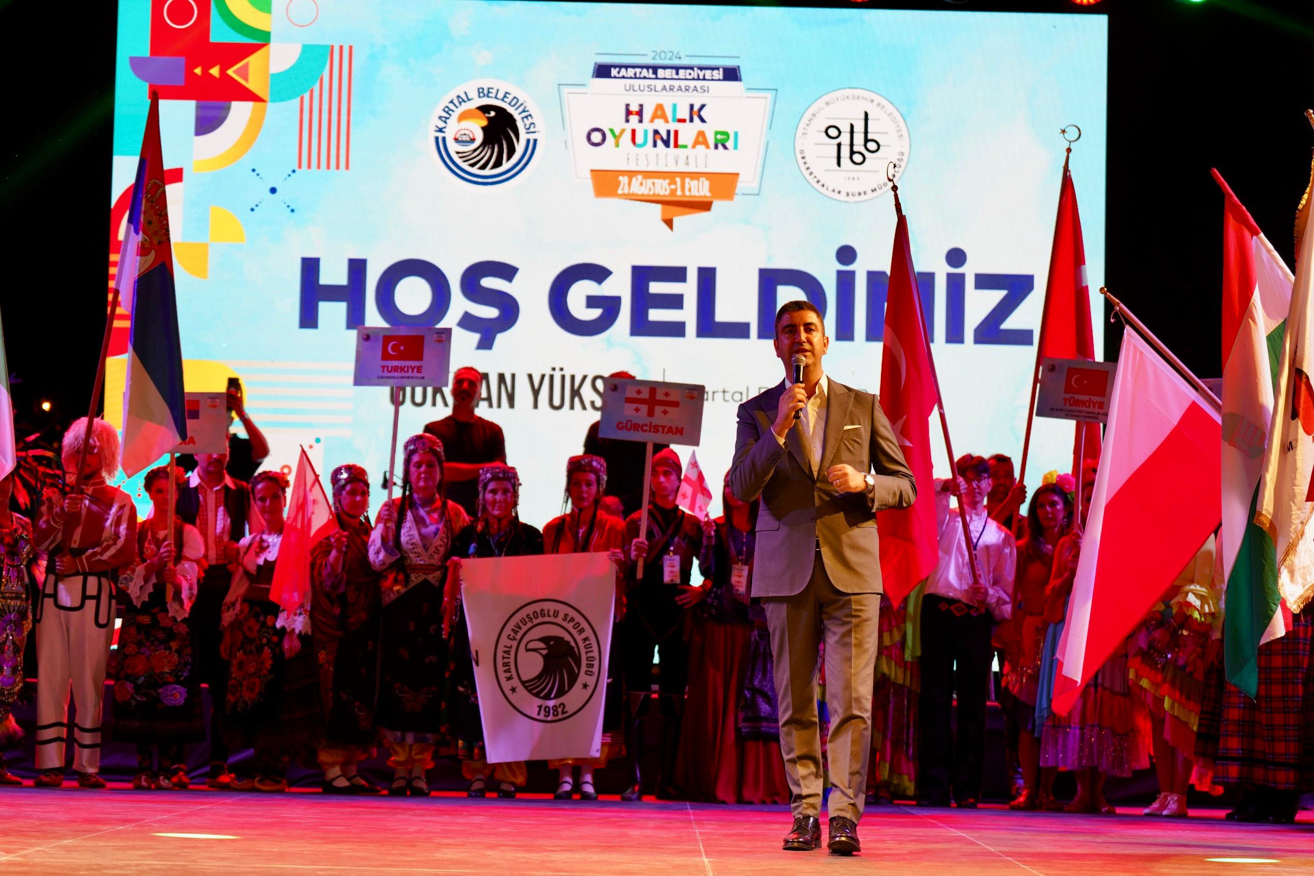 Kartal Belediyesi tarafından bu yıl üçüncüsü düzenlenen ve geleneksel hale gelen Uluslararası Halk Oyunları Festivali, renkli bir yürüyüş ve açılış töreni ile start aldı. Neyzen Tevik Meydanı’ndan Kartal Meydanı’na kadar süren kortej yürüyüşüyle başlayan festival, 1 Eylül tarihine kadar devam edecek.Festivalin açılış günü, Neyzen Tevik Meydanı’ndan Kartal Meydanı’na düzenlenen renkli bir kortej yürüyüşü ile başladı. Yürüyüşe katılan gruplar, kendi ülkelerine ait folklorik kıyafetleriyle ve halk müzikleri eşliğinde büyük bir coşku yarattı. Vatandaşlar, grupların gösterilerini alkışlarla destekleyerek etkinliğe katkıda bulundu.Kartal Belediye Başkanı Gökhan Yüksel, günün ilk etkinliğinde festivalin katılımcılarını Kartal Belediyesi Meclis Salonu'nda ağırladı. Başkan Yüksel, Kartal’ın İstanbul’daki en eski halk oyunları festivallerini düzenleyen ilçe olduğunu vurguladı. Yüksel, "Bu etkinlikler, kültürel mirasımızı yaşatmak ve dünya genelindeki dostluk köprülerini güçlendirmek için büyük önem taşıyor" dedi. Konuşmanın ardından Başkan Yüksel, tüm gruplara Kartal Belediyesi logolu çini tabaklar hediye etti.Festivalin açılış töreni, Kartal Meydanı’nda büyük bir coşkuyla yapıldı. İBB Orkestraları'nın enstrümantal dinletisi ile başlayan açılış töreni, tüm katılımcı grupların sahneye çıkarak vatandaşları selamlamasıyla devam etti. Başkan Yüksel, açılış konuşmasında halk oyunlarının yaygınlaştırılması ve yaşatılmasının önemine değinerek, kültür ve sanatın barış ve dostluğu pekiştirmede oynadığı rolü vurguladı.Festival Programı