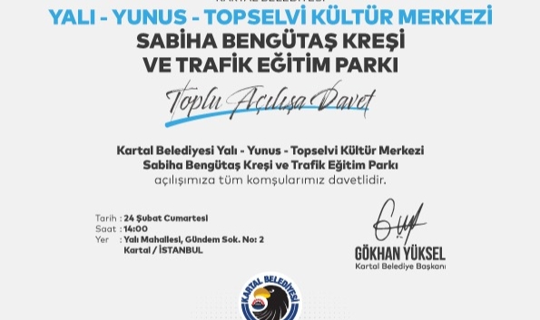 Kartal Belediye Başkanı Gökhan Yüksel, konuya ilişkin açıklamasında; “Kartal’da; kadın çocuk, genç, yaşlı her bir komşumuzu düşünerek hayata geçirdiğimiz 3 büyük projemizi, 24 Şubat Cumartesi hizmete açıyoruz. Kentimizin tek bir bireyini es geçmeden, her detayında büyük emeklerin olduğu projelerimizin toplu açılış törenine tüm komşularımızı bekliyoruz.” dedi. Toplu Açılış Töreni: