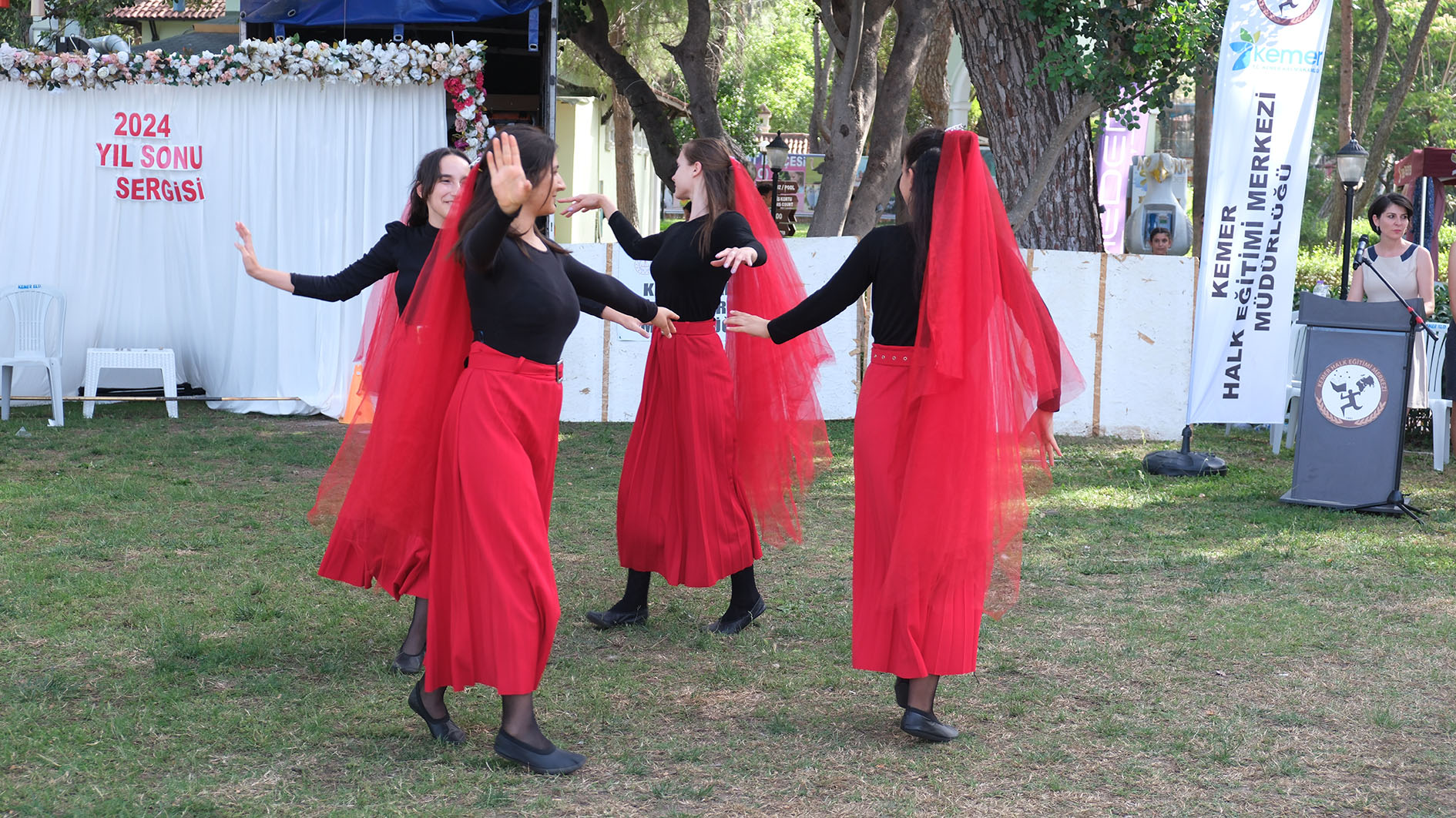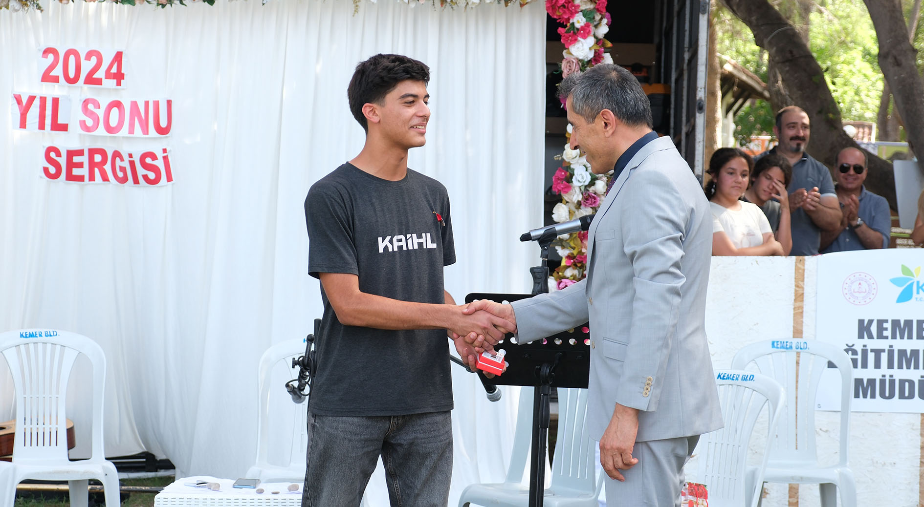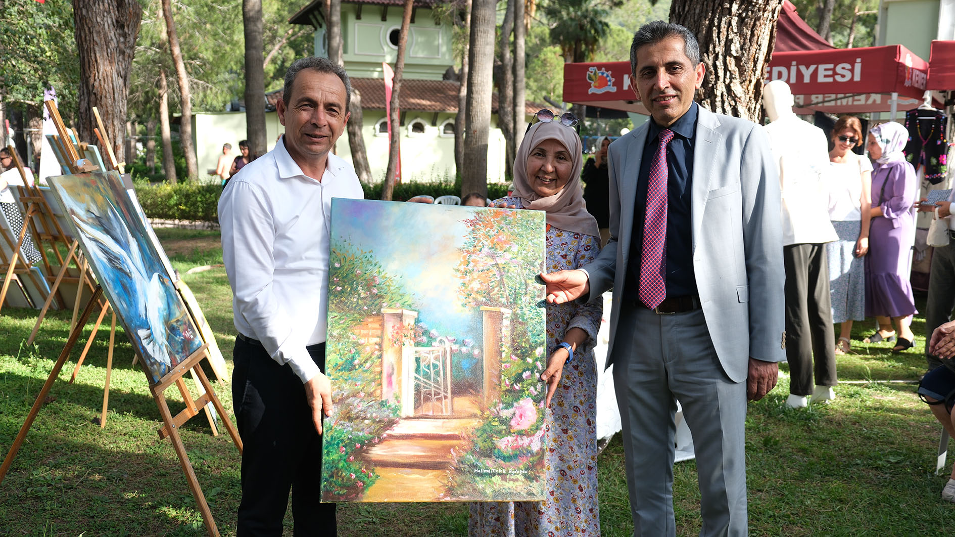 Kemer Belediye Başkan Yardımcısı Mehmet Derya Baytekin, Kemer Halk Eğitim Merkezi’nin yıl sonu sergisine katıldı. Ayışığı Parkı’nda düzenlenen sergiye, Kemer Kaymakamı Ahmet Solmaz, Kemer Belediye Başkan Yardımcısı Mehmet Derya Baytekin, Kemer İlçe Milli Eğitim Müdürü Semra Bekar, Kemer Halk Eğitim Merkezi Müdürü Erdem Can, Halk Eğitim öğretmenleri, kursiyerler ve vatandaşlar katıldı.Saygı duruşunda bulunulmasının ardından İstiklal Marşı’nın okunmasıyla başlayan yıl sonu sergisinde günün anlam ve önemini belirten konuşmalar yapıldı. Yıl içerisinde yapılan farklı kurslarda eğitim veren Kemer Halk Eğitim Merkezi Müdürlüğü tarafından yapılan yıl sonu sergisi büyük beğeni topladı. Kaymakam Solmaz, Belediye Başkan Yardımcısı Baytekin ve protokol üyeleri, çeşitli dans ve spor gösterilerinin de yapıldığı sergi alanındaki eserleri tek tek inceleyerek bilgi aldı. Sergi sonrası Ressam Halime Melek Aydoğdu, yaptığı tabloyu Belediye Başkan Yardımcısı Baytekin’e hediye etti.