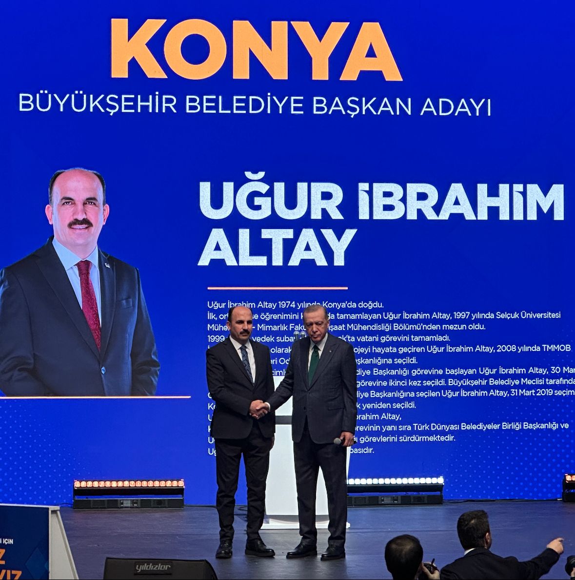 Cumhurbaşkanı Recep Tayyip Erdoğan, 31 Mart yerel seçimlerinde AK Parti’nin Konya Büyükşehir Belediye Başkan Adayının, Konya Büyükşehir Belediye Başkanı Uğur İbrahim Altay olduğunu açıkladı.