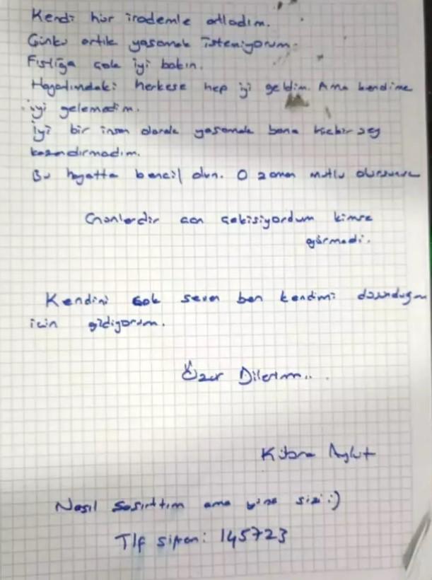 "Kendime layık damat bulamıyorum" diyerek kendi kendine düğün yapan Tiktok fenomeni Kübra Aykut, yaşadığı dairenin 5'inci katından atlayarak intihar etti. Instagram hesabından son zamanlarda verdiği kilolardan yakınan ve sonrasında evine temizlediği anları yayınlayan fenomenin ani ölümü herkesi şaşkına çevirdi. Hayatını kaybeden Kübra Aykut'un geride bıraktığı veda mektubu da olay yerine gelen polisler tarafından bulundu. Fenomen mektubunda "Kendi hür irademle atladım. Çünkü artık yaşamak istemiyorum. Fıstığa çok iyi bakın. Hayatımdaki herkese çok iyi geldim. Ama kendime iyi gelemedim. İyi bir insan olarak yaşamak bana hiçbir şey kazandırmadı. Bu hayatta bencil olun. O zaman mutlu olursunuz. Günlerdir can çekişiyordum, kimse görmedi. Kendimi çok seven ben kendimi düşündüğüm için gidiyorum. Özür dilerim. Nasıl şaşırttım ama yine sizi" ifadelerine yer verdi.