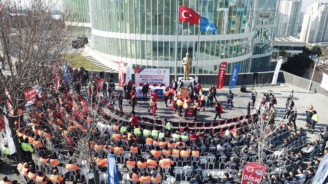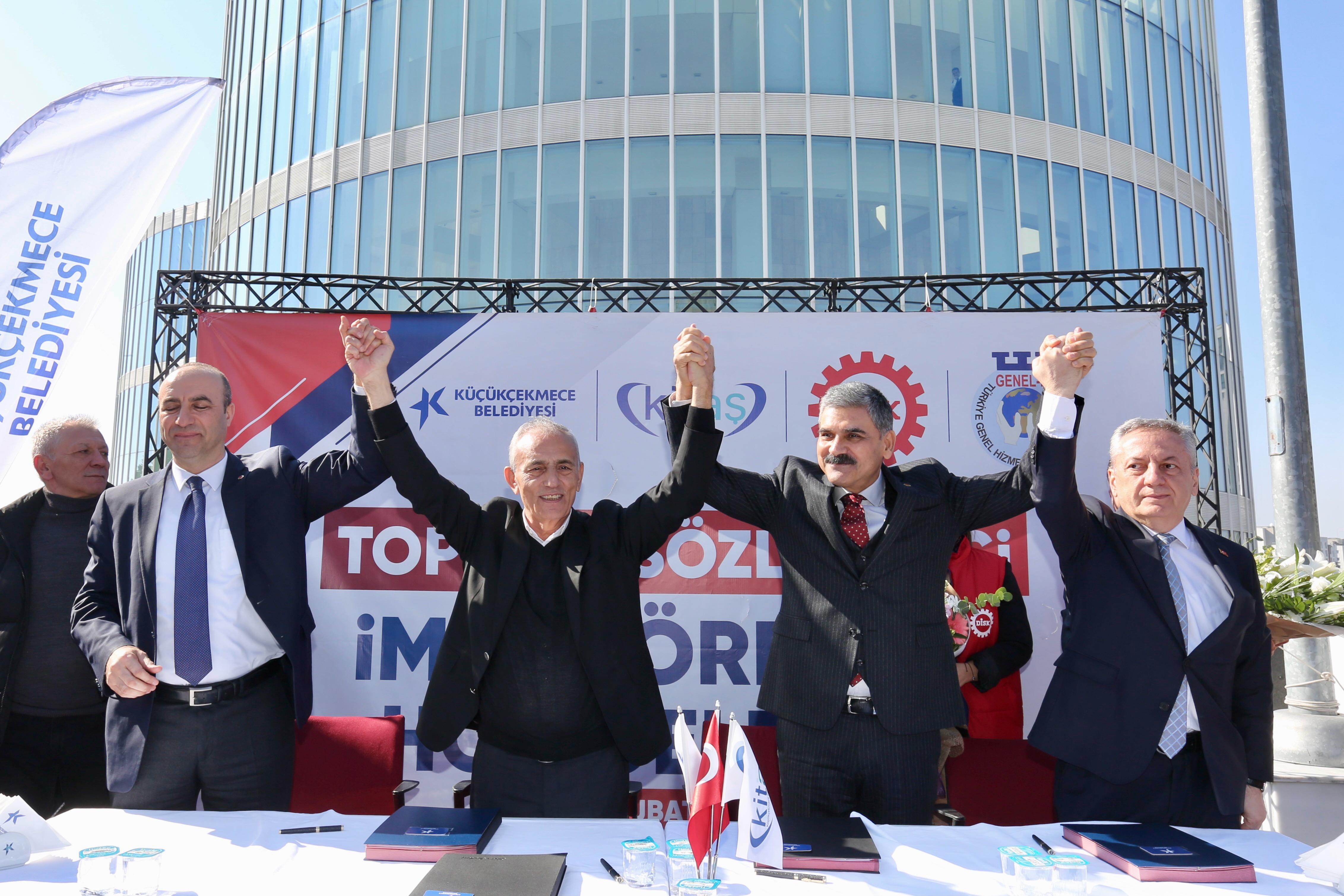 Küçükçekmece Belediyesi ile DİSK Genel- İş Sendikası tarafından, Belediye yanı tören alanında ‘Toplu İş Sözleşmesi’ imzalandı. Yeni iş sözleşmesine göre belediye işçilerinin maaşlarına yüzde 76 zam yapılarak, özlük hakları iyileştirildi. Çalışanlar ise, toplu iş sözleşmesini alkışlarla ve halaylarla kutladı. Küçükçekmece Belediyesi ve DİSK Genel- İş Sendikası tarafından Küçükçekmece İnşaat Taahhüt Sanayi ve Ticaret Anonim Şirketine bağlı çalışan işçileri kapsayan Toplu İş Sözleşmesi imzalandı. İmza töreni; Küçükçekmece Belediye Başkanı Kemal Çebi, Başkan Yardımcıları, Disk- Genel İş Sendikası Başkanı Remzi Çalışkan, Araştırma Daire Başkanı Adil Çiftçi, 2 No’lu Şube Başkanı Ersin Korkmaz, KİTAŞ Yönetim Kurulu Başkanı Fatih Üstünbaş, sendika temsilcileri ve belediye işçilerinin yoğun katılımıyla gerçekleştirildi. Başkan Çebi: Biz bu şartları israfı önleyerek, bereketli bütçelerle oluşturduk