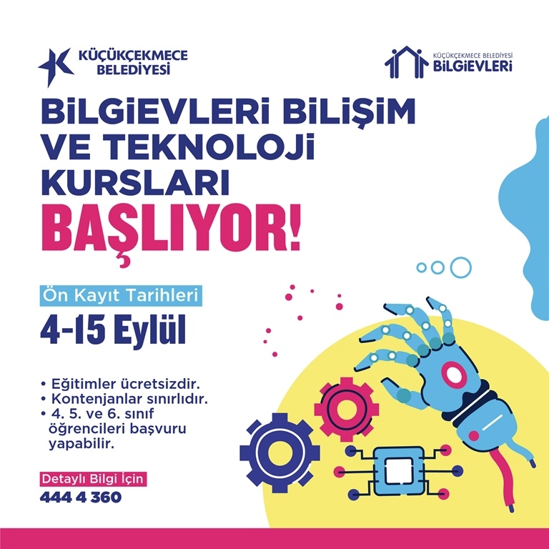 Küçükçekmece Belediyesi, ücretsiz olarak düzenlediği Bilgievleri ve Çocuk Üniversitesi kurslarının yeni dönem kayıtlarını başlattı. Gençlik ve Spor Hizmetleri Müdürlüğü tarafından yürütülen bu programlar, Halkalı, Cennet, Sefaköy, İkitelli, Kanarya, Mehmet Akif ve Yarımburgaz Bilgievleri ve Çocuk Üniversitesi'nde gerçekleştirilecek. Kurslar, öğrencilere çeşitli branşlarda eğitim fırsatları sunacak.Uygulamalı Gelişim Atölyeleri: İlkokul 2, 3 ve 4. sınıf öğrencileri için çeşitli branşlar sunan atölyelerde öğrenci merkezli eğitim esas alınıyor. Eğitimler arasında ‘Dört İşlem’, ‘Güzel Türkçem’, ‘Miniskop’, ‘Masallarla Öğreniyorum’ ve ‘Pratik Hayat Atölyesi’ gibi konular yer alıyor. Teorik bilgilerin yanı sıra uygulamalı deneyler ve doğa gezileri de düzenleniyor.Sanat Kursları: 8-14 yaş arası çocuklar için sunulan sanat kurslarında, bağlama, piyano, halk oyunları, resim ve satranç gibi çeşitli branşlarda eğitimler veriliyor.Bilişim ve Teknoloji Kursları: 4, 5 ve 6. sınıf öğrencilerine yönelik olan bu kurslar üç yıllık bir eğitim programı sunuyor. İlk yıl ‘Kodlamaya Giriş’, ikinci yıl ‘Robotik Kodlama’ ve üçüncü yıl ‘Robotik Mühendisliği’ eğitimi veriliyor. Kurs sonunda başarılı olan öğrencilere katılım sertifikası veriliyor ve Türkiye ile uluslararası düzeyde düzenlenen yarışmalara katılma fırsatı sunuluyor.İngilizce Kursları: 4. ve 5. sınıf öğrencilerine yönelik iki yıllık İngilizce kursları A1 ve A2 seviyelerinde sunuluyor. İlk kur başarıyla tamamlayan öğrenciler, ikinci kuru da tamamlayarak İngilizce eğitimini tamamlıyorlar.Kurslara başvurmak isteyenler, Halkalı, Cennet, İkitelli, Kanarya, Mehmet Akif, Sefaköy ve Yarımburgaz Bilgievleri'ne şahsen başvuruda bulunabilirler. Kontenjanların sınırlı olduğu kurslar için ön kayıt sürecinin son günü 15 Eylül olarak belirlenmiş durumda. Ayrıntılı bilgi almak ve başvuru yapmak için 444 4 360 numaralı hattı arayabilirsiniz.