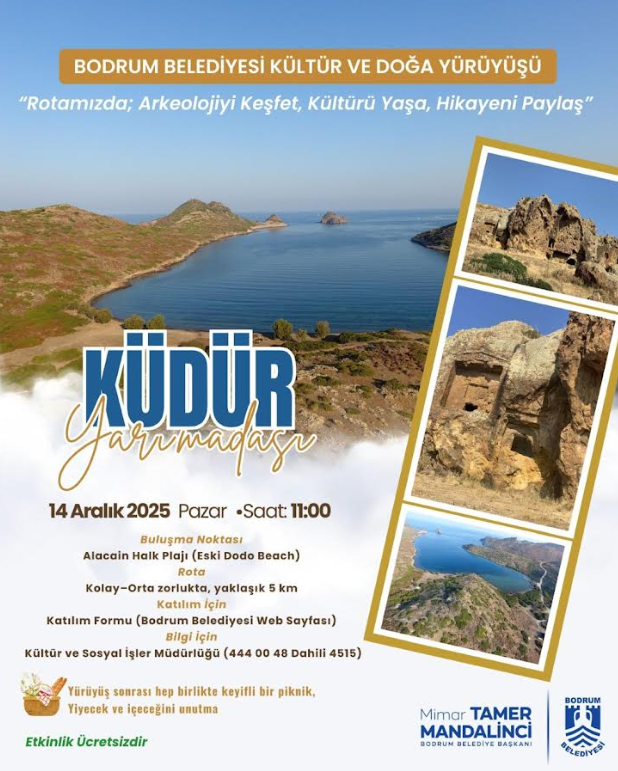 Bodrum Belediyesi Kültür ve Sosyal İşler Müdürlüğü bünyesinde çalışmalarını sürdüren Pedasa ve Leleg Uygarlığı Araştırma ve Uygulama Birimi tarafından organize edilen Kültür ve Doğa Yürüyüşleri, bu hafta sonu Yalıkavak Küdür Yarımadası’nda gerçekleştirilecek yeni etkinlikle devam ediyor.“Rotamızda; Arkeolojiyi Keşfet, Kültürü Yaşa, Hikâyeni Paylaş” sloganıyla düzenlenen yürüyüş, 14 Aralık Pazar günü katılımcıları Küdür Yarımadası’nın doğal güzellikleriyle buluşturacak. Etkinlik kapsamında, bölgenin tarihî ve kültürel zenginlikleri yerinde keşfedilecek; doğayla iç içe keyifli bir yürüyüş gerçekleştirilecek.Sosyal belediyecilik anlayışıyla kente kültürel ve tarihsel farkındalık kazandırmayı amaçlayan ücretsiz etkinlik, Alacain Halk Plajı’nda buluşmayla başlayacak. Toplu taşıma kullanmak isteyenler için saat 10.30’da Yalıkavak Otogarı’ndan belediye aracıyla Küdür’e ring seferi düzenlenecek.Yürüyüşün ardından tüm katılımcıların birlikte piknik yapacağı belirtildi. Belediye yetkilileri, etkinliğe katılacaklara atıştırmalık, piknik malzemeleri ve sandalye getirmeleri konusunda hatırlatmada bulundu.Etkinliğe katılmak isteyenler duyuruda belirtilen bağlantı üzerinden kayıt yapabilecek; ayrıntılı bilgi almak isteyenler ise 444 00 48 / dahili 4515 numaralı hattı arayabilecek.