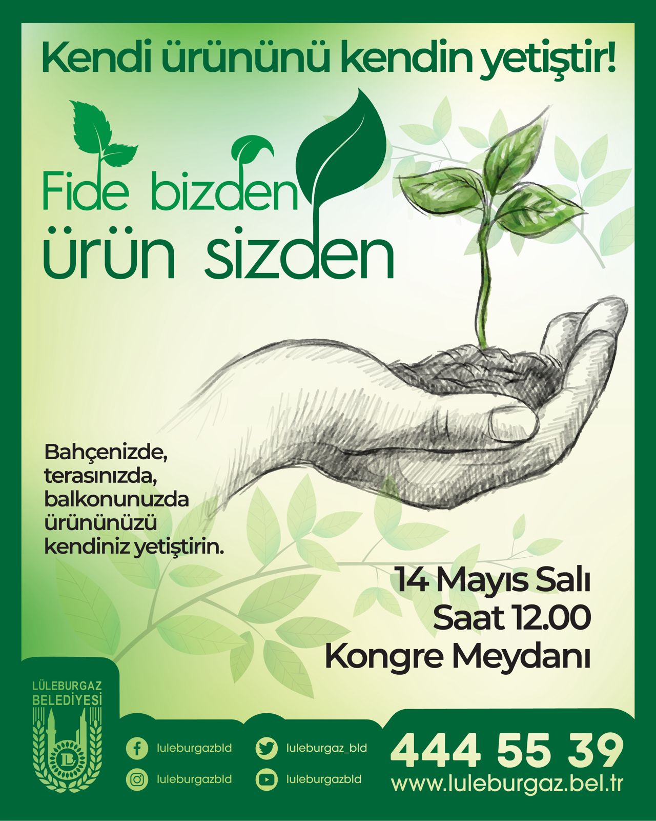 Lüleburgaz Belediyesinin serasında atalık tohumlardan elde ettiği 12 bin 500 adet sebze fidesi 14 Mayıs saat 12.00’da Kongre Meydanında vatandaşla paylaşılacak. Lüleburgaz Belediyesi doğal ve sürdürülebilir bir çevre anlayışıyla gerçekleştirdiği “Fide Bizden Ürün Sizden” etkinliği kapsamında bu yıl da binlerce fideyi vatandaşla paylaşacak.Şimdiye kadar 22 bin 500 adet domates, salatalık, biber gibi atalık tohumlardan elde edilen fideleri Lüleburgazlılara dağıtan Lüleburgaz Belediyesi, aynı etkinliği çok daha fazla fide sayısıyla bu yıl da gerçekleştirecek. 12 bin 500 adet fide dağıtılacakBu doğrultuda Lüleburgaz Belediyesi 14 Mayıs saat 12.00’da Kongre Meydanında düzenlenecek etkinlikle belediyeye ait serada yetiştirilen 12 bin 500 adet fideyi vatandaşla paylaşacak.Vatandaşlar aldıkları fideleri teras, balkon ya da bahçelerinde yetiştirebilecek. Lüleburgaz Belediyesi “Fide Bizden Ürün Sizden” etkinliğiyle önemi her geçen gün artan tarımsal üretimde doğal ve sürdürülebilir tarımsal üretime yönelik farkındalık oluşturuyor.